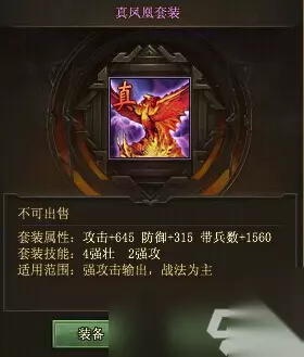 类型:大幅提高血量(带兵数) 适用范围:可大量使用借兵的影帝级人物,或需要短时间消耗大量粮食的人。装备后大约增加4万5的兵力,可以大幅提升战斗获得经验! 适配武将:百搭型,快速升级必备 2、朱雀套装