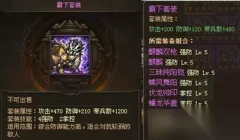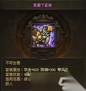 套装图纸获得方式: a. 98级,五星通关单人剧本“刘备入蜀” b. 101级,点券商城购买获得 适用范围: 战法强力、统属性不错的武将 适配武将: 黄忠 8、真霸下套装