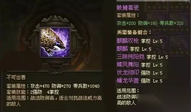 类型:大幅提高防御力 适用范围:国家防守任务、非国家任务时期攻城,减少粮食消耗。 适配武将:百搭(防御装) 5、鲮锂套装