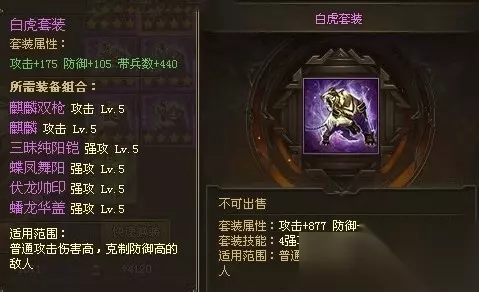 类型:大幅提高战法伤害力 适用范围:攻打比自己等级略高,防御较高的人或刷禁卫军使用。 适配武将:夏侯惇、甘宁、许诸 3、白虎套装
