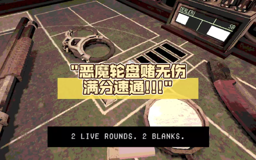 这是关于《恶魔轮盘赌》的无伤速通内容,展示了游戏内的轮盘赌对局场景、弹药设置以及相关道具界面,分享该游戏的无伤速通玩法。