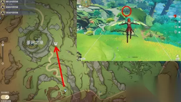 4、三号地灵龛,位于荼诃之座高处,从丘丘角斗场锚点一路往北飞就能看到;