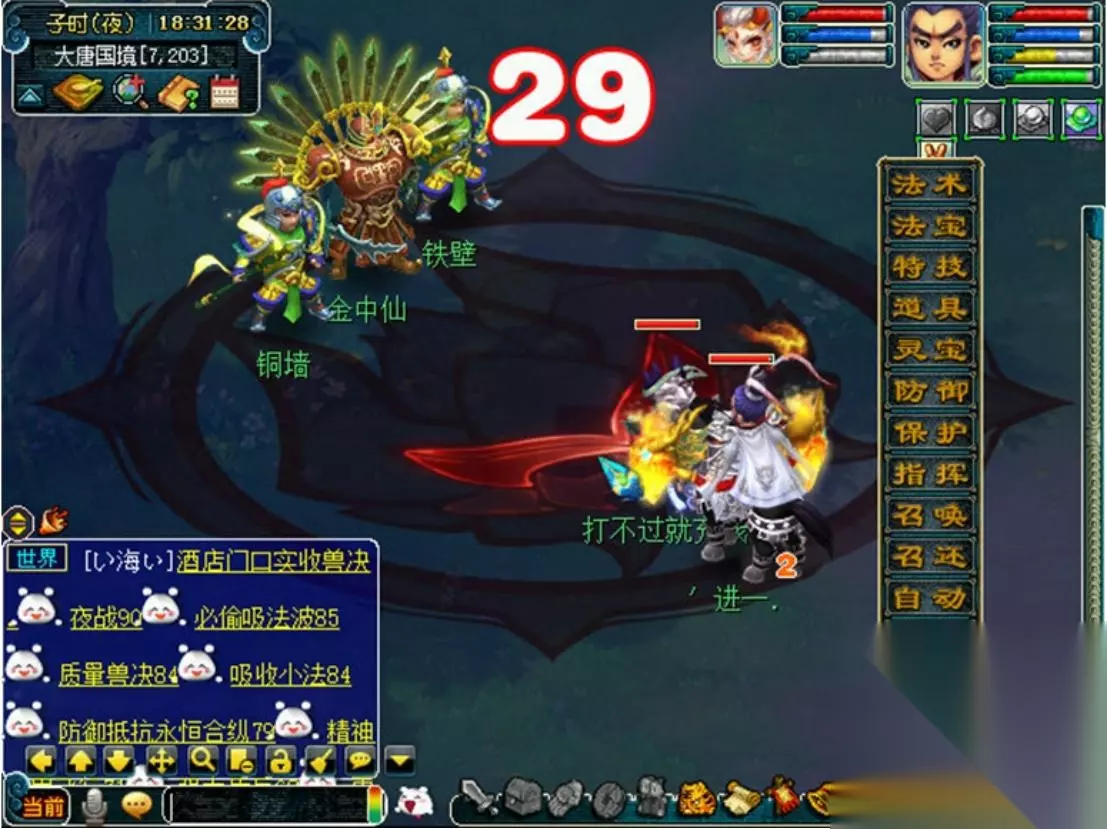 金中仙:大唐国境(7.201),拥有绝对的防御,更有“铜墙”、“铁壁”两大护法助阵,凡人难以撼动。若主怪死亡时,铜墙铁壁仍在场,会继续召唤主怪。铜墙铁壁血量不多,带法系召唤兽可快速击杀~