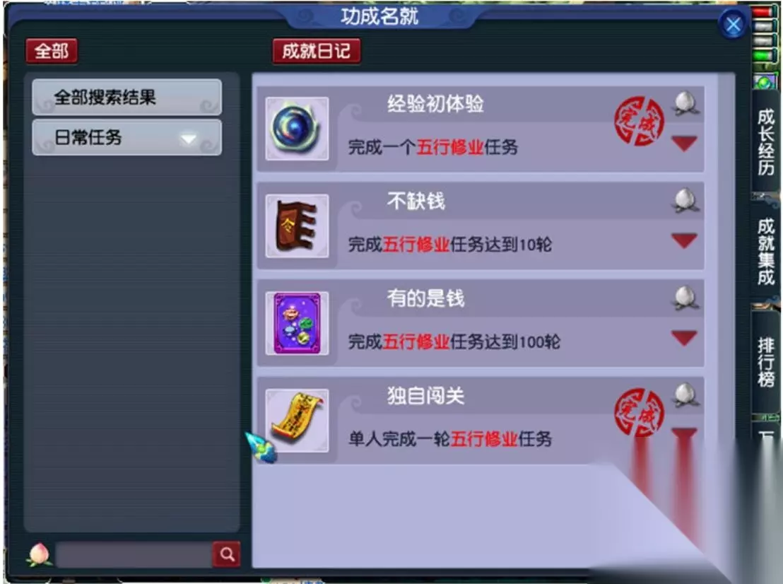 最后,附上此玩法关联的成就。总的来说,五行修业任务相对简单,运气好10分钟左右就可跑完20环,因为下一环经常刷同个怪。对于修炼和技能全满的玩家(尤其是化九玩家)而言,不失为一个快速补充三界的方法。