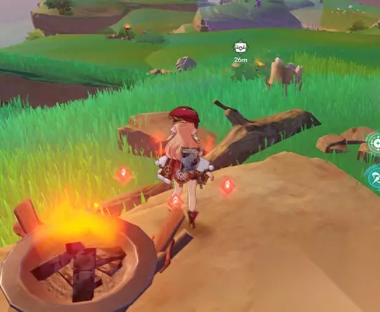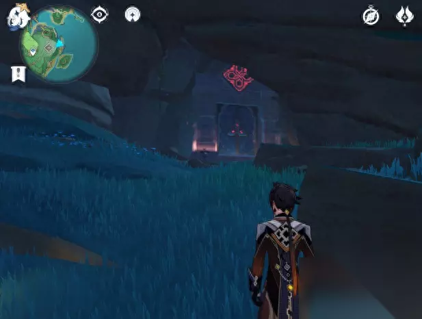 首先我们来到地图的这个位置,图上蓝色的状态是因为我已经进去给各位写攻略所以激活了。你们接触到应该是灰色的状态,不可以直接进行传送。我们还是一如既往地从边上的传送点飞过去。 到达这个位置之后,你会发现在这个副本的大门前,有一个启动装置,但是启动装置是锁住的。 启动装置的边上有“四个”火把,全部点燃之后,启动装置才能激活。(到这里为止,全都是没有任何任务提示和指引的,所以,没有人告诉你这个火把能激活这个装置从而激活这个副本的话,就全靠运气。这一点任务指引米哈游做的很不好。)