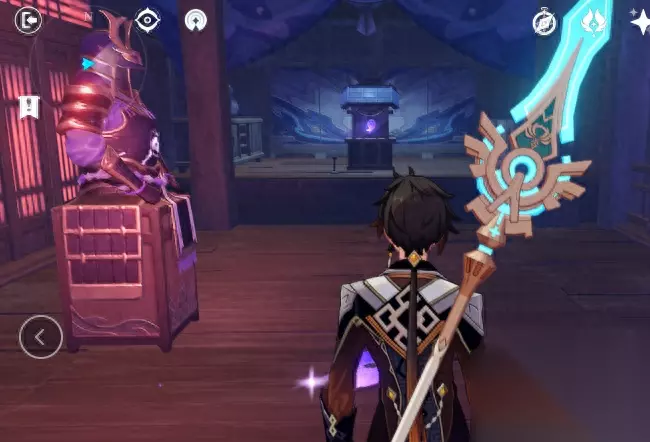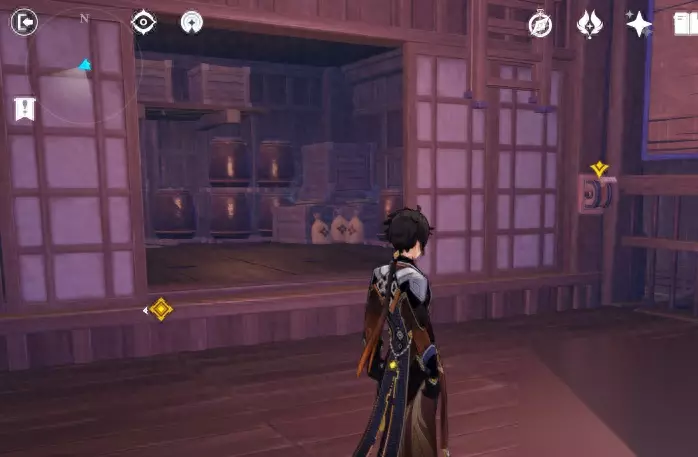 在借景之馆门前,你一定要站住,然后抬起头,去看这个被炸出来的山洞的顶部。 你可以在山洞的顶部看到一个雷神瞳。(亲测可以用温迪站在钟离的柱子上,飞上去拿到。如果没有,建议用岩主代替钟离,给温迪站着飞上去。或者,直接爬墙壁。) 进入之后就一直往纸门里面走,首先会遇到一个向下的梯子。重点是,如果你在这个位置使用重击,你就会直接破坏下方的地板。而在梯子的边上,是有一个普通宝箱的。如果你好好爬梯子下去,就能开启这个宝箱。重击下去,地板碎了,你就够不到梯子了。 拿了宝箱之后,你再重击下去,把地板砸穿,这个时候,你来到了“看似一楼,实则二楼的位置”。这不要紧,你就走到尽头的地方,然后启动如图所示的机关,利用机关,就可以爬上梯子。先不要急着去二楼,先不要急着去二楼,先不要急着去二楼。