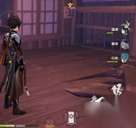 你需要重击如图所示,右下角的那些烂木板。(这就是推荐带岩主的原因,如果让你在这么小的地方通过爬梯子来进行重击其实是非常卡手的。利用岩主、钟离、温迪、万叶这类能腾空的东西重击这个烂木板就会比较顺手)才能够从这个看似一楼,实则二楼的位置落下去,落到真正的“一楼”,然后在这个一楼,找到放在盔甲边上的第一个开门用的勾玉。