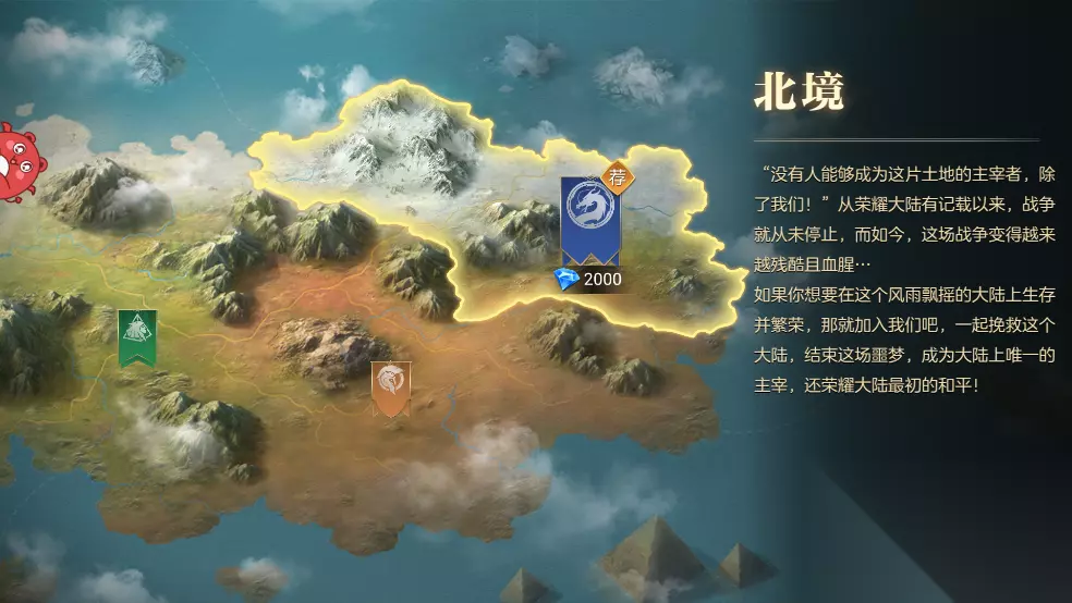 二、北境 没有人能够成为这片土地的主字者,除了我们!从荣耀大陆有记载以来,战争就从未停止,而如今,这场战争变得越来越残酷且血腥…如果你想要在这个风雨飘摇的大陆上生存并繁荣,那就加入我们吧,一起挽救这个大陆,结束这场噩梦,成为大陆上唯一的主宰,还荣耀大陆最初的和平!