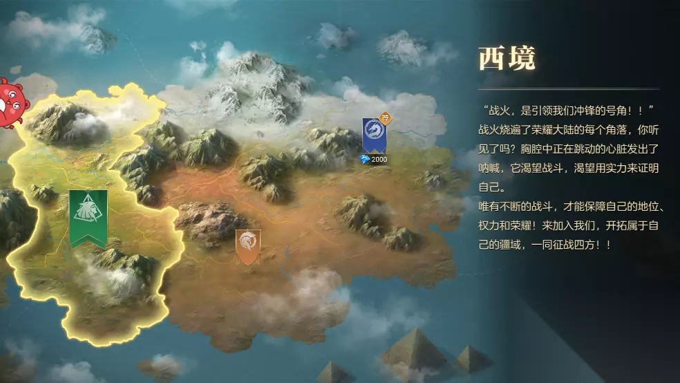 一、西境 战火,是引领我们冲锋的号角!!战火烧遍了茉耀大陆的每个角落,你听见了吗?胸腔中正在跳动的心脏发出了呐喊,它渴望战斗,渴望用实力来证明自己。唯有不断的战斗,才能保障自己的地位、权力和荣耀!来加入我们,开拓属于自己的疆域,一同征战四方!!