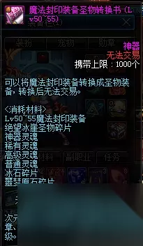首先我们需要的第一个道具就是魔法封印装备圣物转换书,该物品无法交易,只能通过地下城掉落,但是掉落率比较高。自己升级过程中就能收集到,可能很多玩家根本没有注意到这个东西。