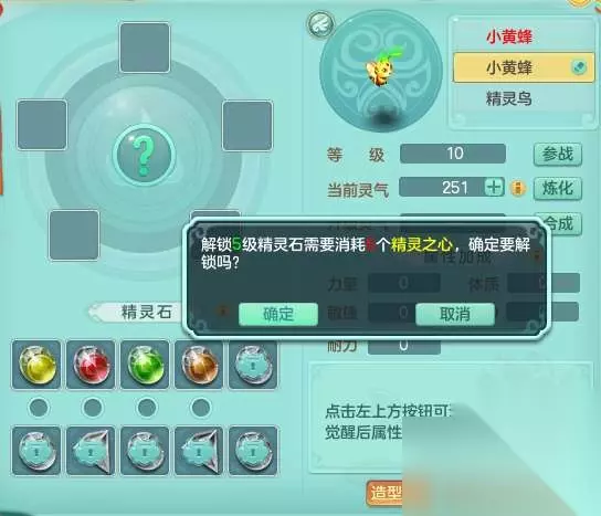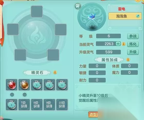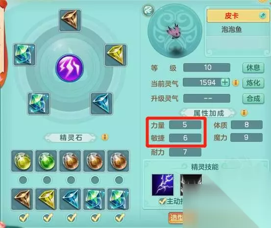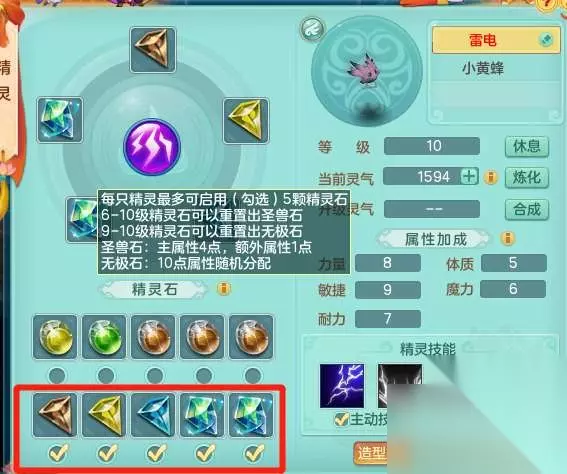 3.升级和重置精灵石 获取精灵后,先是升级精灵等级,将精灵提升至满级(10级) 按从上到下,从左到右顺序,十颗精灵石分别代表1-10级精灵石。 只有6-10级精灵石可能出现圣兽石(主属性4点,额外属性1点) 只有9-10级精灵石可能出现无极石(10点属性,随机分配) 由于每只精灵只能启用5颗精灵石,因此常规情况下只需要关注6-10级石头即可。