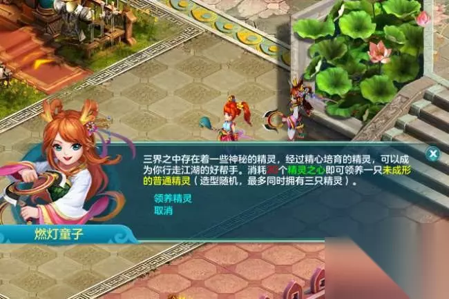 1、培育精灵的步骤 1.精灵的获取 《神武4》精灵可以通过精灵之心进行领养和升级。20个精灵之心可以在女儿国(48,46)燃灯童子处领养一只未成形的普通精灵,继续消耗精灵之心可以解锁精灵石,解锁完十级精灵石一共需要消耗30个精灵之心。