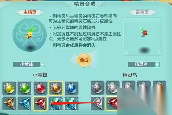 使用灵气和"月光石"可以重置精灵石,俗称"洗石头" 二、精灵的合成属性加成规则 圣兽石是4点主属性+1点随机 无极是10点随机属性 当副精灵与主精灵的精灵石类型相同时,合成可为主精灵的对应石头增加属性。 增加到圣兽石时,圣兽石主属性+1,最高上限为5点附加属性 增加到无极石时,随机属性+1,最高上限为5点附加属性