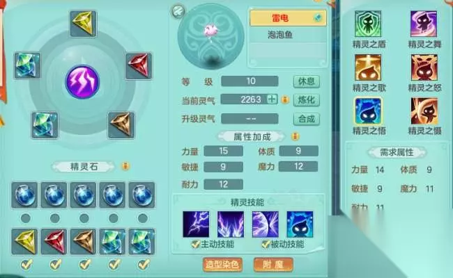 四技能精灵的属性要求及效果: 要求: 力量≥9 体质≥10 敏捷≥9 魔力≥15 耐力≥11 精灵之舞效果: 封印和抗封印成功率增加3% 要求: 力量≥9 体质≥14 敏捷≥9 魔力≥11 耐力≥11 精灵之歌效果: 气血为0时有30%几率复活并恢复20%+100的气血,最高不超过等级×10,每场战斗最多触发1次。 要求: 力量≥9 体质≥9 敏捷≥14 魔力≥11 耐力≥11 精灵之怒效果: 造成伤害时有5%概率提高10%伤害结果,或受到伤害时有5%概率降低10%伤害结果,每个效果每回合最多触发1次。 要求: 力量≥11 体质≥11 敏捷≥11 魔力≥11 耐力≥11 精灵之悟效果: 受法术或特技恢复气血效果增加5% 要求: 力量≥14 体质≥9 敏捷≥9 魔力≥11 耐力≥11 精灵之慑效果: 受到伤害时,有5%概率反弹伤害结果的20%,每回合最多触发1次。 要求: 力量≥9 体质≥9 敏捷≥10 魔力≥12 耐力≥14 从效果来看,封系优先选择精灵之舞,输出职业优先选择精灵之怒,而精灵之歌对于全职业来说均是个很好的选择。 从难度上来看,精灵之怒要求的总属性为55点,适合最求极致输出的少侠。其它五种技能要求的总属性均为54点,难度稍微低一些。