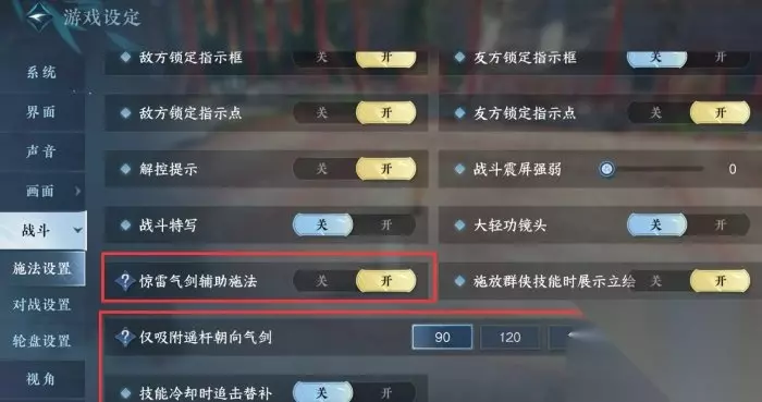惊雷冷却追击替补关的原因是,首先会导致我们的剑意循环错乱,其次也会影响到部分技能的追击循环,吸附摇杆剑气的角度,角度越小越方便自己练操作,推荐是90-120如果选到360,就会出现剑在背会的时候,你使用惊雷直接把你镜头调转然后冲到气剑方向的情况,换言之,角度越小操作误差会更小,更容易控制,还有在某些特定情况下如果想用惊雷跑路,设置里面要调整一个选自己的快捷键,这样在选自己之后,使用惊雷就可以朝自己的面向突进了