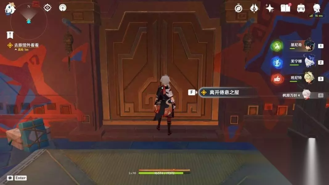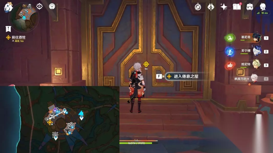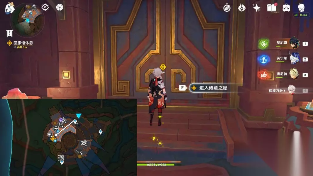 【摇曳灯火一分为二】 1.回旅馆休息 传送圣火竞技场二楼锚点,往地图的西方向走 ▶前往一楼“进入倦意之屋”,与派蒙对话;