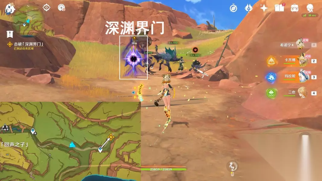 6.前去支援商队 传送「回声之子」东方向锚点,往地图的东北方向走,击破「深渊界门」