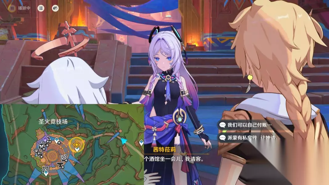 14.跟随茜特菈莉换个地方 传送圣火竞技场二楼锚点,按图中指引路线走 ▶前往三楼“圣火竞技场看台”,与茜特菈莉对话3分钟;