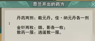 药方上的材料:截元丹*1、佳·纳元丹*1、金针-烟/影各*1、逍遥散*1。 可以直接去交易行购买或者自己做,必须是可交易的,系统送的绑定材料不可用。