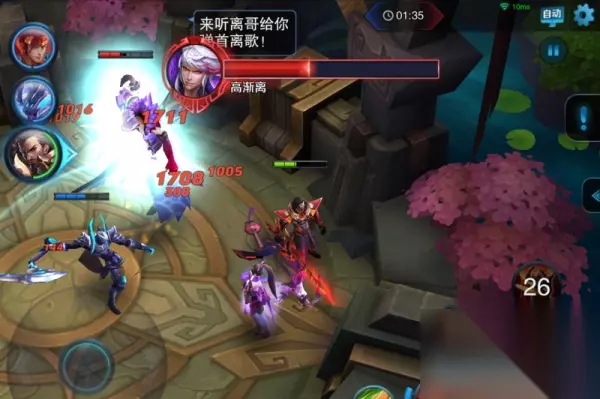然后再清理两拨怪物就整整绕了一圈到达湖中心了,湖中心是高渐离周围是一堆侍从为他回血,如果我们去一个一个的击杀侍从肯定来不及,所以我们可以直接去打高渐离,打的时候前面可以普通攻击,等到高渐离还剩下大约三分之一血的时候,可以使用曹操的2技能打一下,让侍女来不及給高渐离回血。