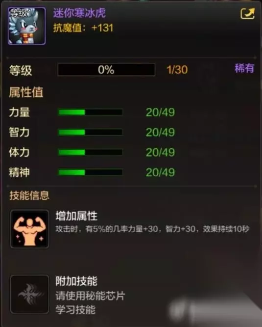 级别:稀有 抗魔值:131 【属性值】 力量:20/49 智力:20/49 体力:20/49 精神:20/49 【技能】 增加属性:攻击时,有5%的几率增加30点力量和30点智力,效果持续10秒 获得途径: 2、或者在宠物商店(萌宠兑换)中通过萌宠币购买宠物;使用在超级大乱斗中获得的迷你币,也可以兑换特别的宠物。