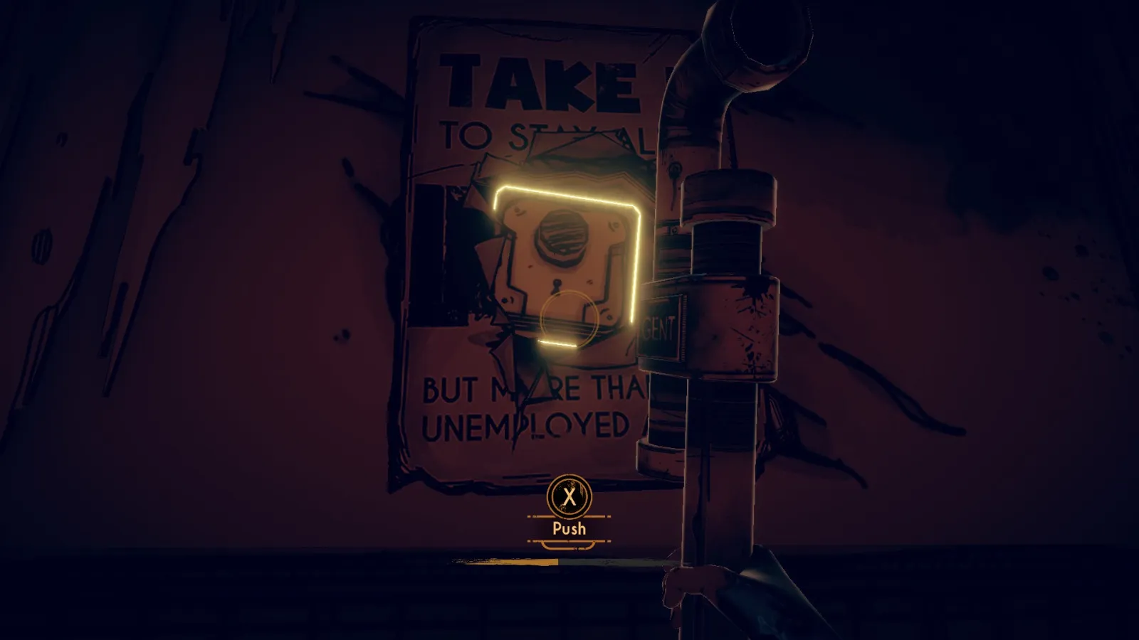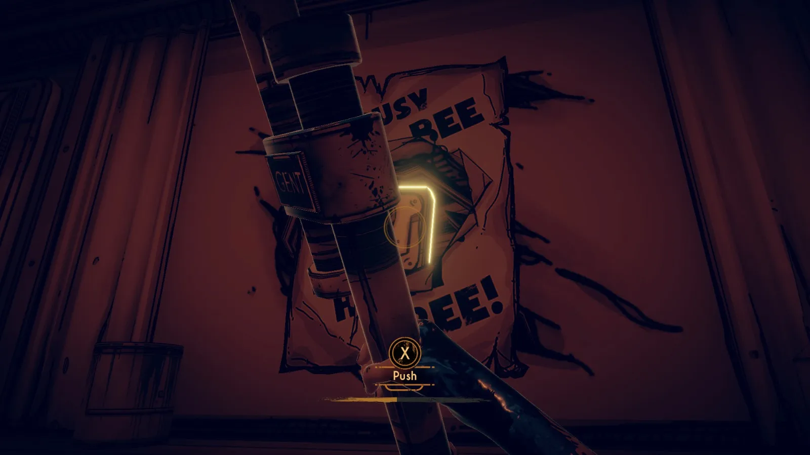 用你的铁管敲击海报中心,即可显露出一个隐藏按钮。按下按钮1。