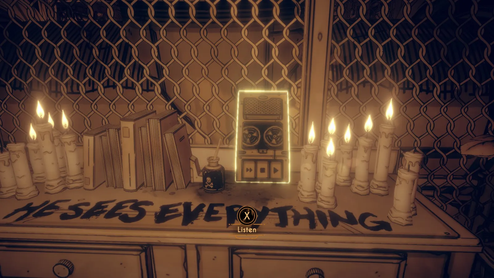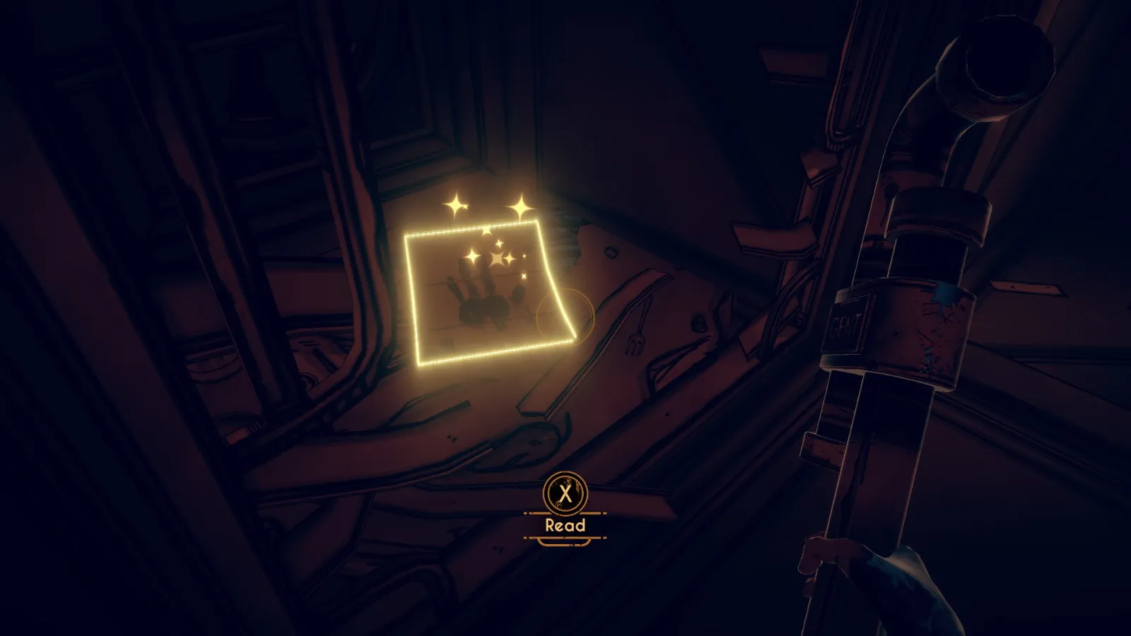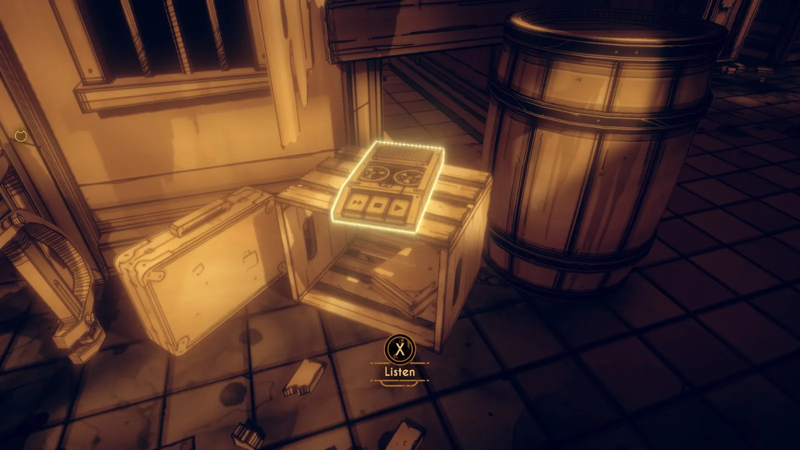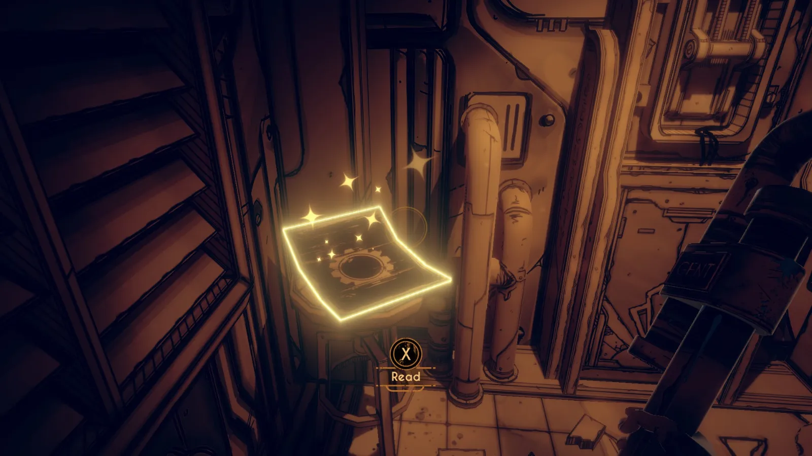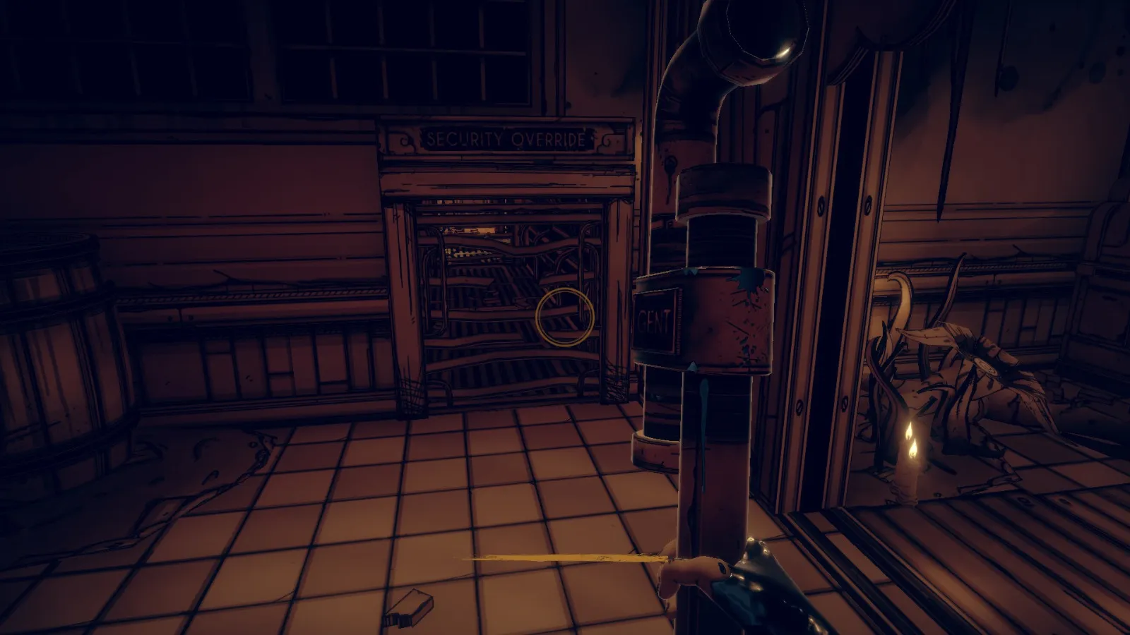 现在从 Bendy 立牌旁边的洞(你找到备忘录 11 的地方)重新进入房间。