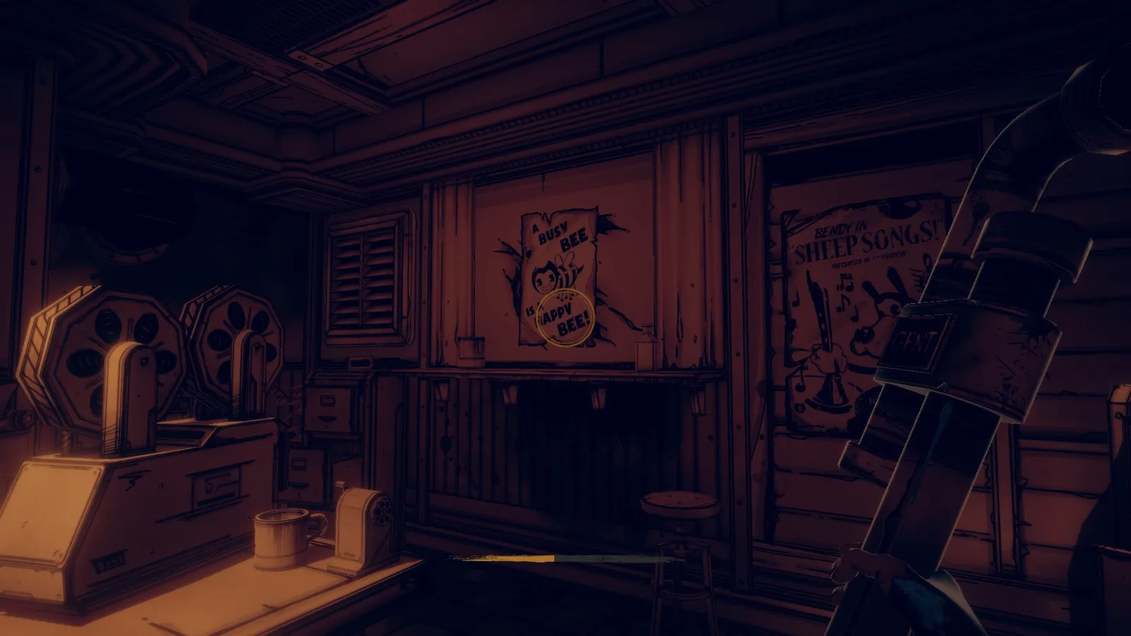 击打凳子上方的海报(海报上 Bendy 是一只蜜蜂),然后按下海报后面的按钮 2。