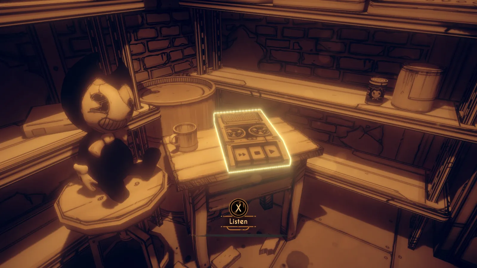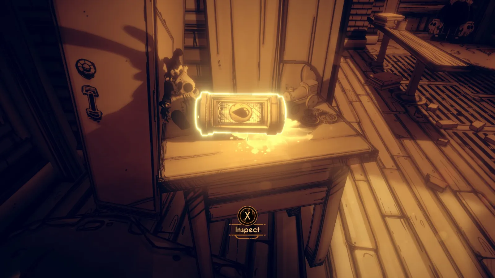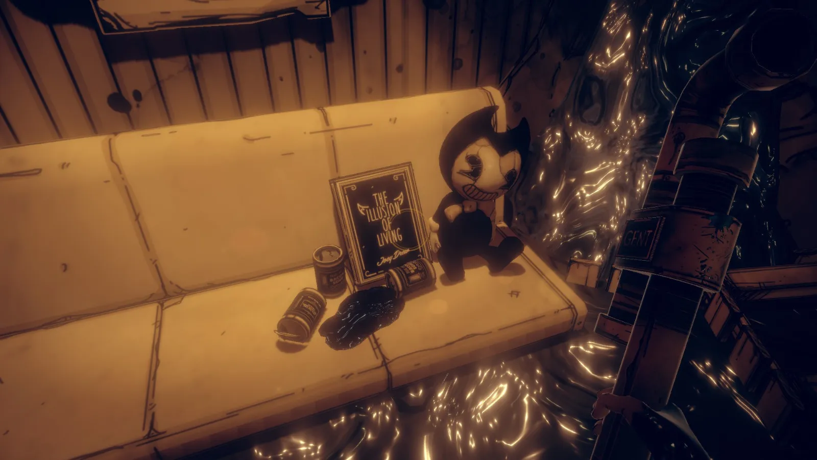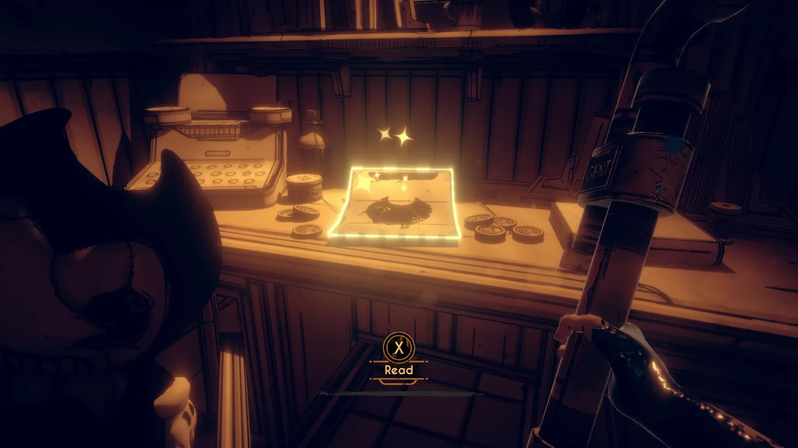 你现在在地下室。拿走不稳定墨水(2/10) 从放着 Bendy 立牌的桌子旁开始。