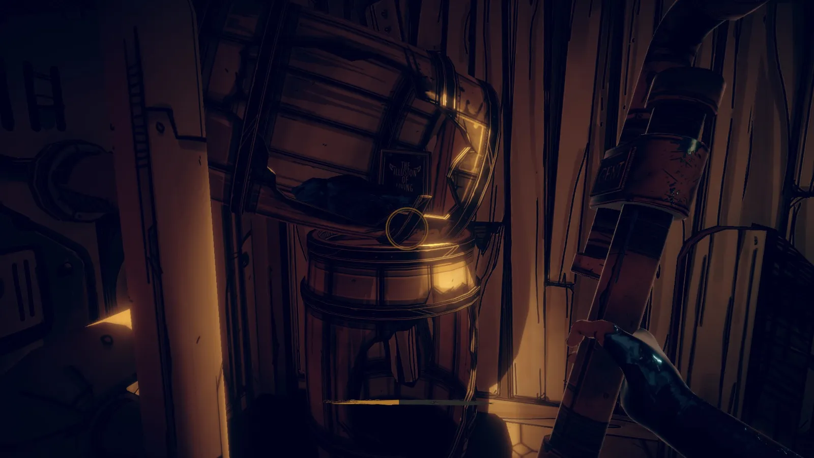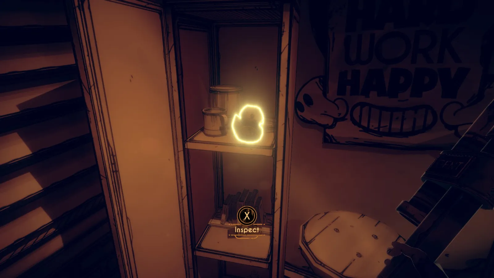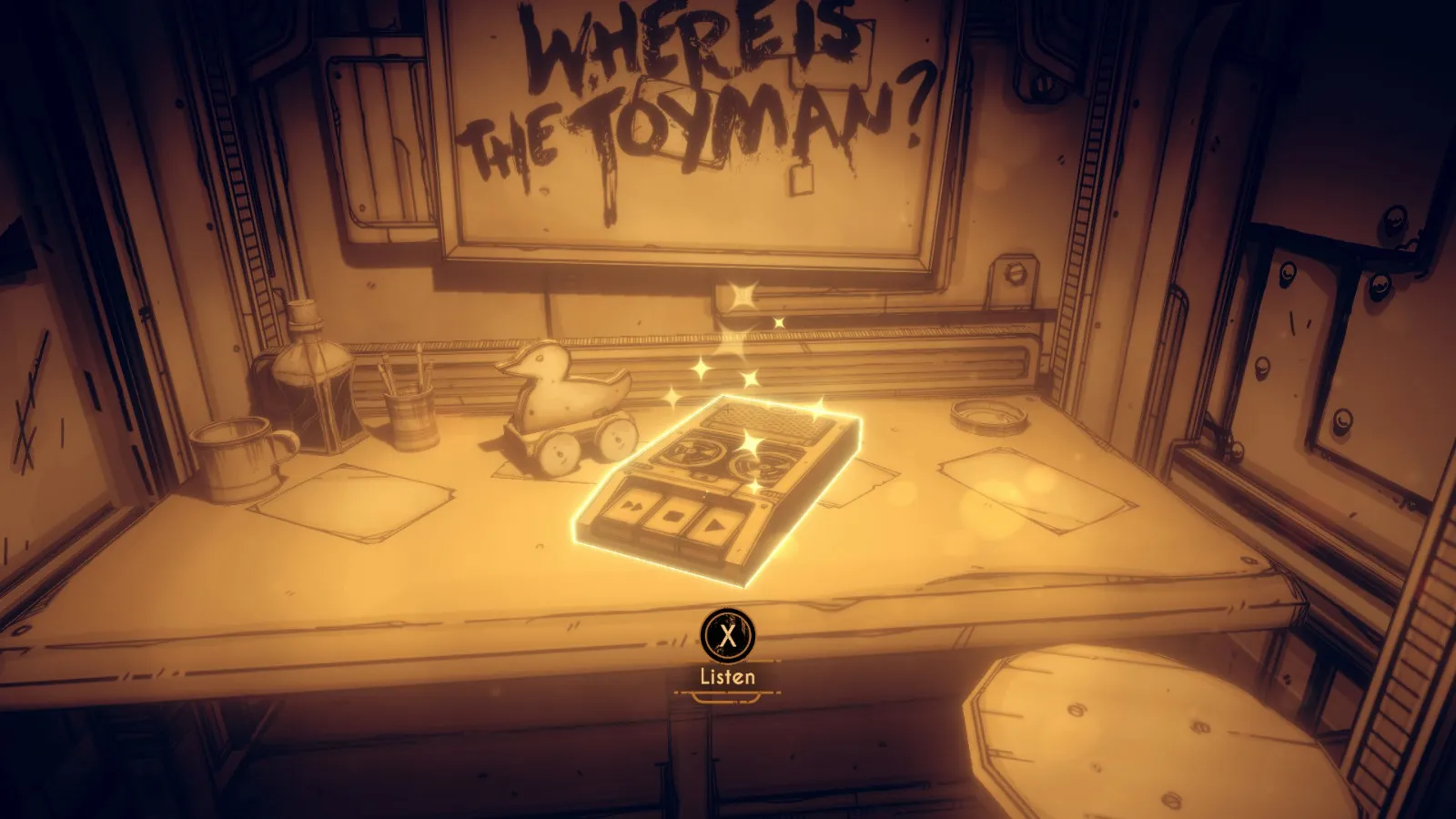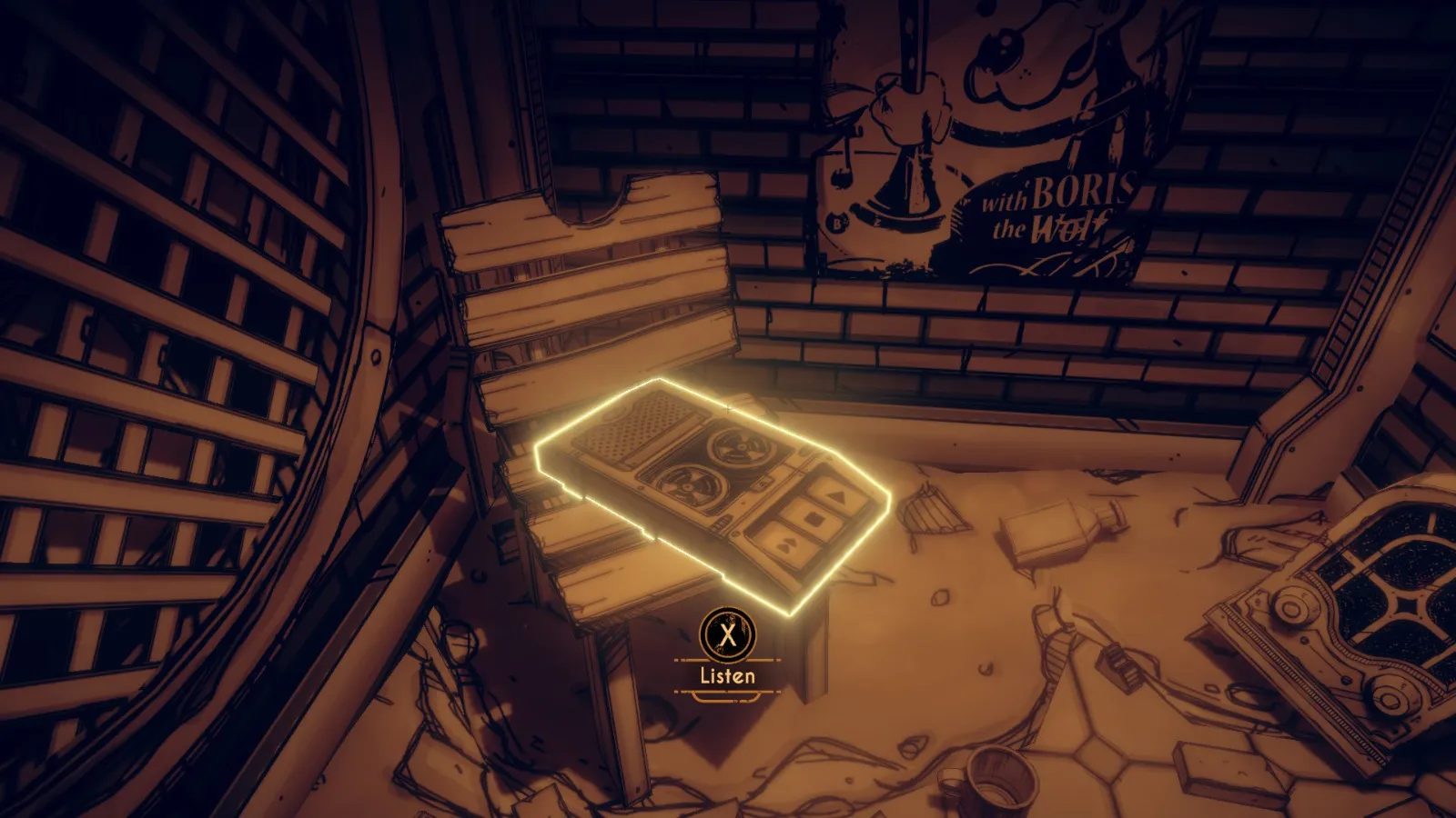 你现在在地下室。拿走不稳定墨水(2/10) 从放着 Bendy 立牌的桌子旁开始。