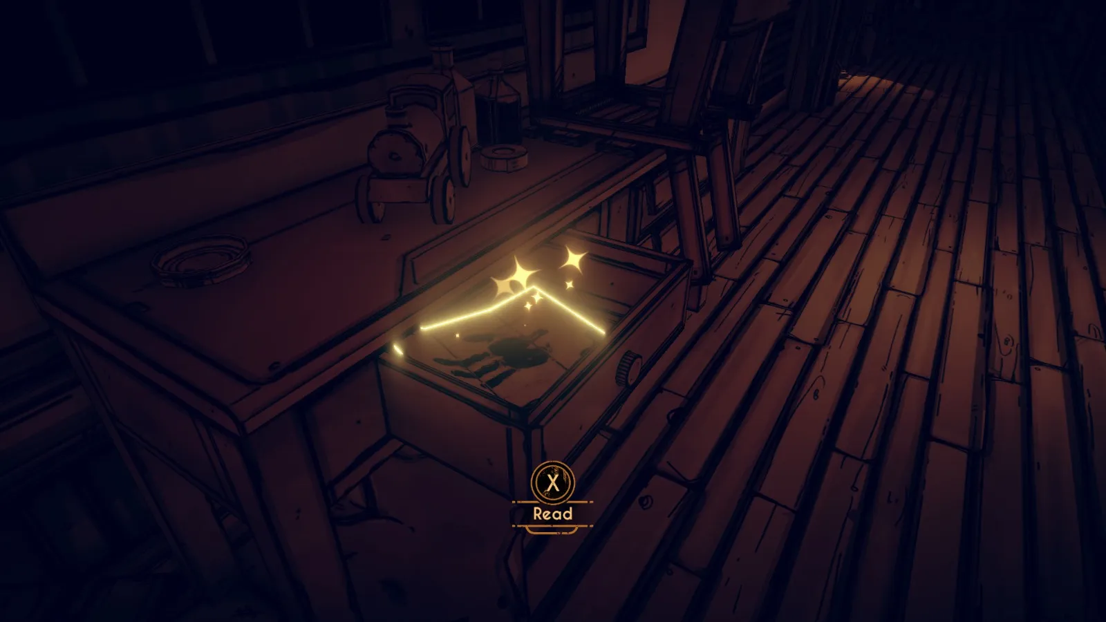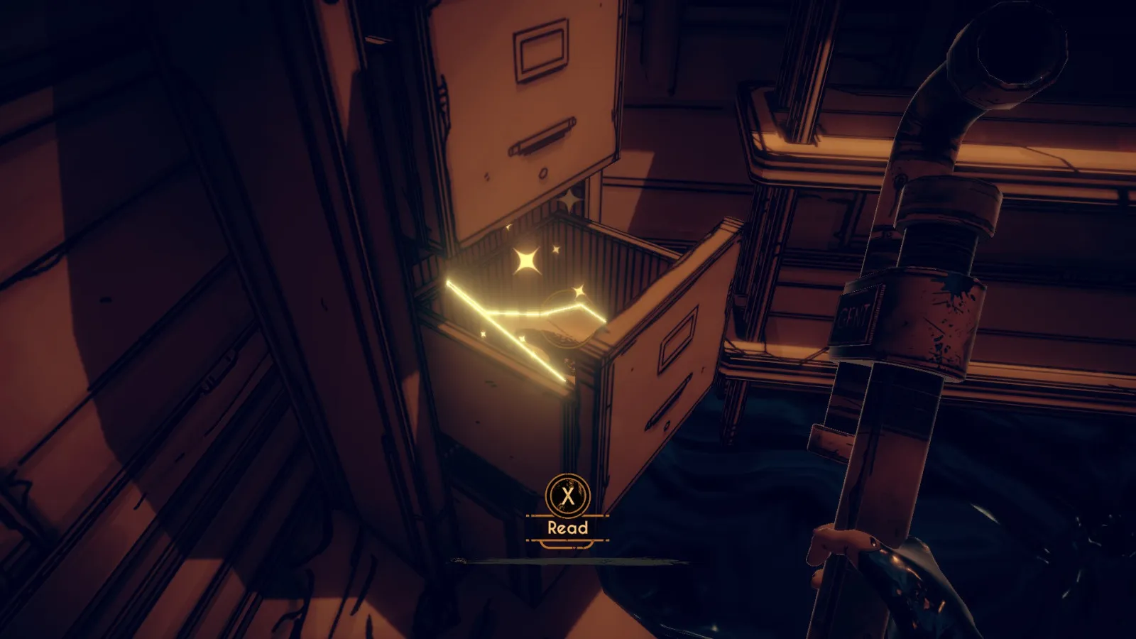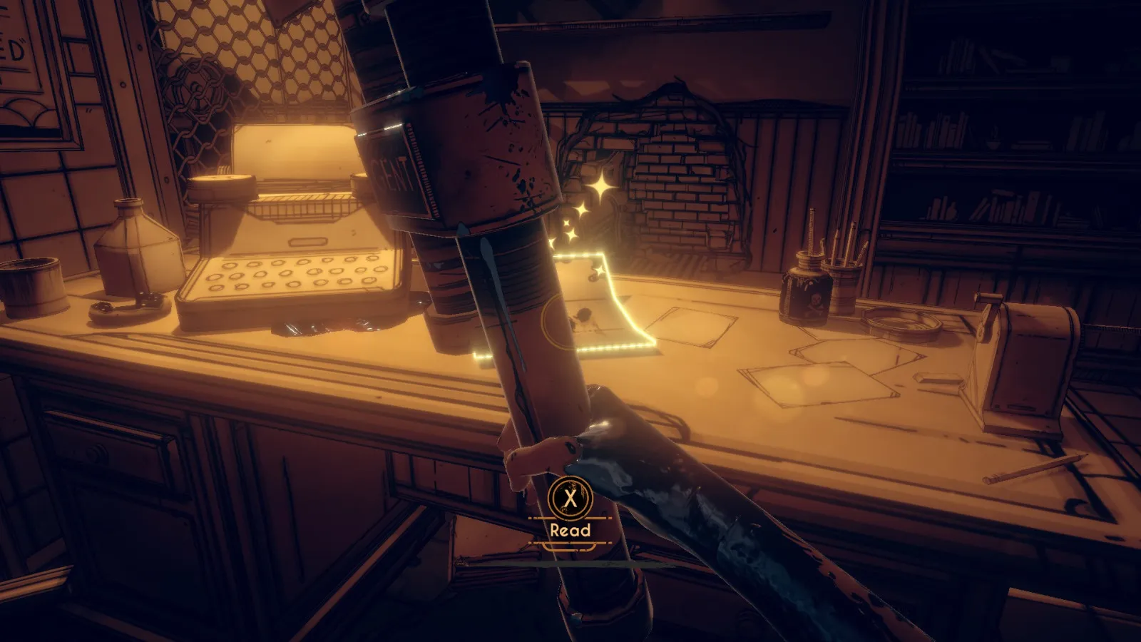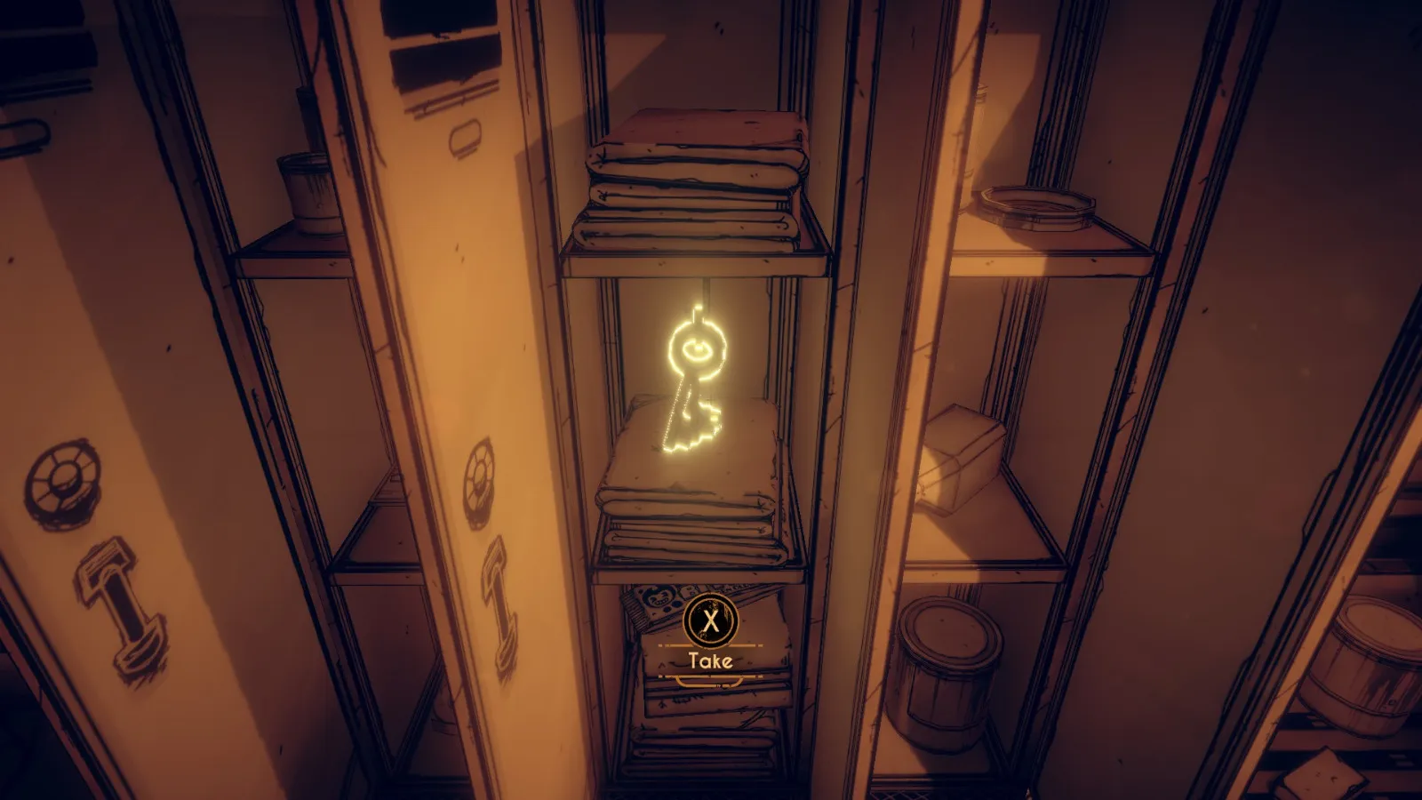 你现在在地下室。拿走不稳定墨水(2/10) 从放着 Bendy 立牌的桌子旁开始。