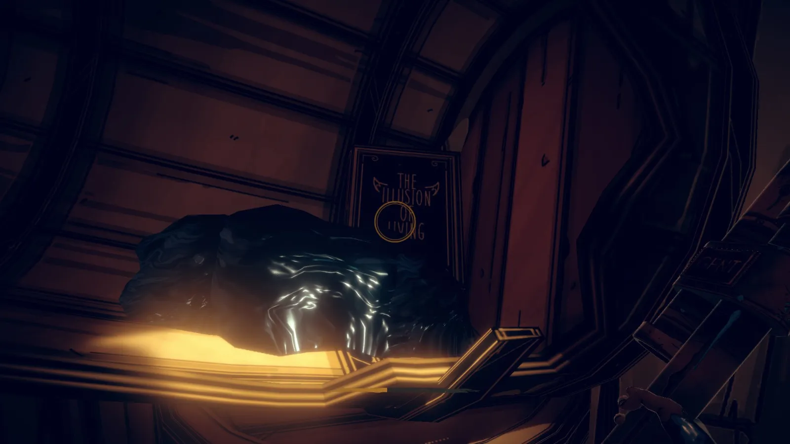 沿着旁边的黑暗走廊往下走,尝试通过右侧墙上的把手打开门,触发一段过场动画,结束本章节。