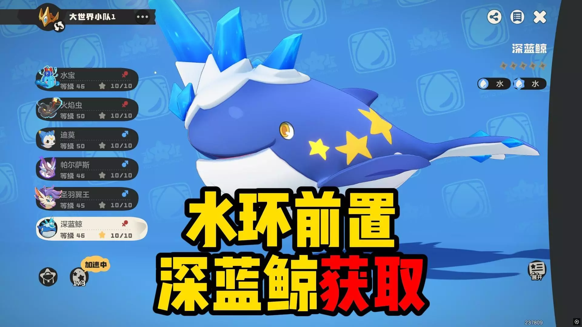 这是《水环》公测版本深蓝鲸的获取攻略,需先将洛克里安图鉴达到100,在沉船漩涡附近找到树苗唤醒获得精灵果实,要在海边深水环境的庇护所使用,以此吸引获取深蓝鲸。