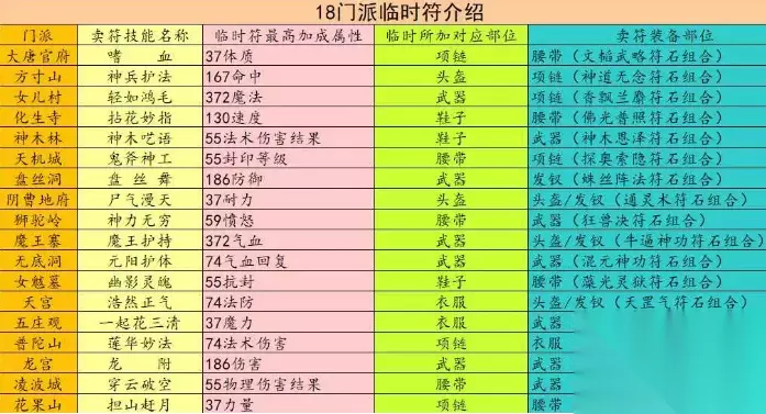 梦幻西游所有临时符介绍 大唐官府 体质符:最高增加技能等级*0.2的体质点数; 方寸山 命中符:最高增加技能等级*1的命中; 化生寺 速度符:最多增加技能等级*0.7的速度; 女儿村 魔法符:最多增加技能等级*2的魔法值; 神木林 固定伤害符:最多增加技能等级*0.3的固定伤害; 龙宫 伤害符:最多增加技能等级*1的伤害; 五庄观 魔力符:最多增加技能等级*0.2的魔力值; 普陀山 法伤符:最多增加技能等级*0.4的法术伤害; 天宫 法防符:最多增加技能等级*0.4的法术防御;