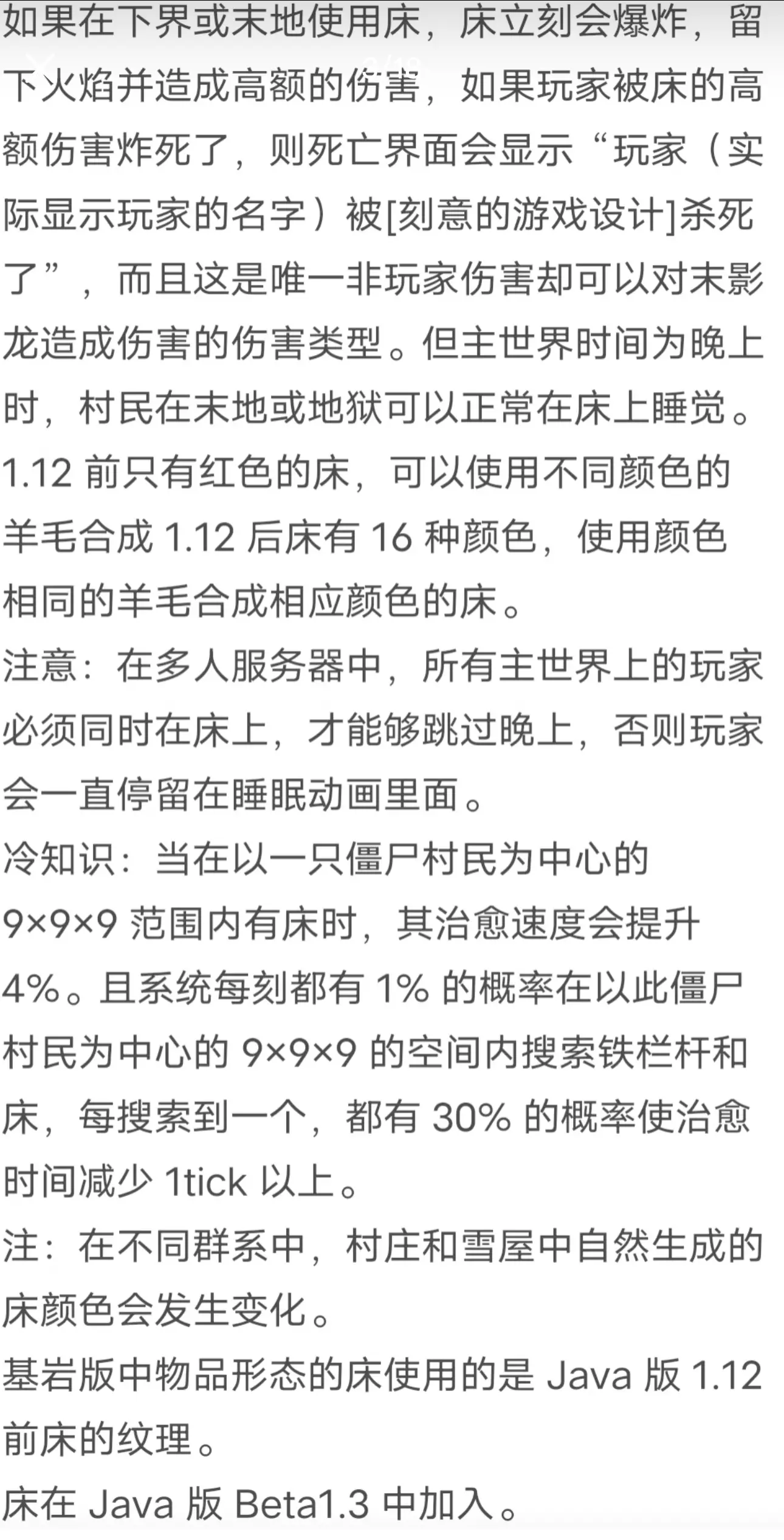 床(Bed)是一种允许玩家在晚上睡觉和重设玩家出生点的透明方块。它可以在雪屋以及村庄中生成,也可以使用羊毛和木板合成得到。 它可用任何工具或徒手开采,也可以通过被活塞推动使得掉落它自身。 它虽然不是可燃物,但仍可被熔岩点燃。 床会减免约 55% 的跌落伤害。 床的碰撞箱为 9/16 格(即比半格多一像素),因此玩家可以从床上走到别的方块上,而不能从地面走到床上。Java 版中,床是不含水方块,玩家甚至可以在水中睡觉;而基岩版中床是含水方块,无法在水中睡觉。 床占 2 格的空间。放置床需要从玩家面前算起两格的空间。放置床时,床尾将面向使用者。像其它方块一样,床不能放在非固体方块上。如果玩家移除了床下面的方块,床会浮空而不会被移除。也可以利用床免除摔落伤害,做法为在离地面较近时迅速放下床再躺下。实际操作比较困难。 只能在晚上使用它,准确的时间刻为 12541 至 23458(并包括这 2 个值)。使用后将会在一段睡眠动画中自动跳过晚上,下方会有一个“起床”按钮,点击即可立即起床,但是如果在这一段动画中玩家受到攻击或者床被摧毁,则玩家会被迫起床。 如果设置了重生点之后床被摧毁或者被阻挡,则会显示“你的床或已充能的重生锚不存在或已被阻挡”。玩家如果在三天内没有睡觉(或死亡),幻翼会在其周围生成。 玩家、生物或掉落物掉到床上时会被反弹。反弹高度和跌落高度正相关。 当玩家在床的三格开外企图和床交互的时候,左下角会显示“床太远了”(Java 版)或者“你不能休息,床离你太远”(基岩版)。 当玩家在规定距离内和床交互的时候,首先一定有一条“已设置重生点”,并且设置此地为玩家下一次的重生点,如果是白天则会显示“你只能在夜间或雷暴中入眠”(Java 版)或“你只能在晚上睡觉”(基岩版)。 当使用 /setblock 放置床时,只会放置床的一半,因为床是 2 格宽的。1 格床可以当一整张床那样睡上去,两个在一起的床会拼接成一张完整的床。 如果以床为中心的 8×8×5 的范围内有敌对生物的话,玩家不能睡觉,会显示“你不能休息,周围有怪物在游荡”。 玩家也不能在被别的玩家占用的床或者村民睡觉睡到空中的床上睡觉,尝试睡觉会显示“这张床已被占用”。#我的世界
