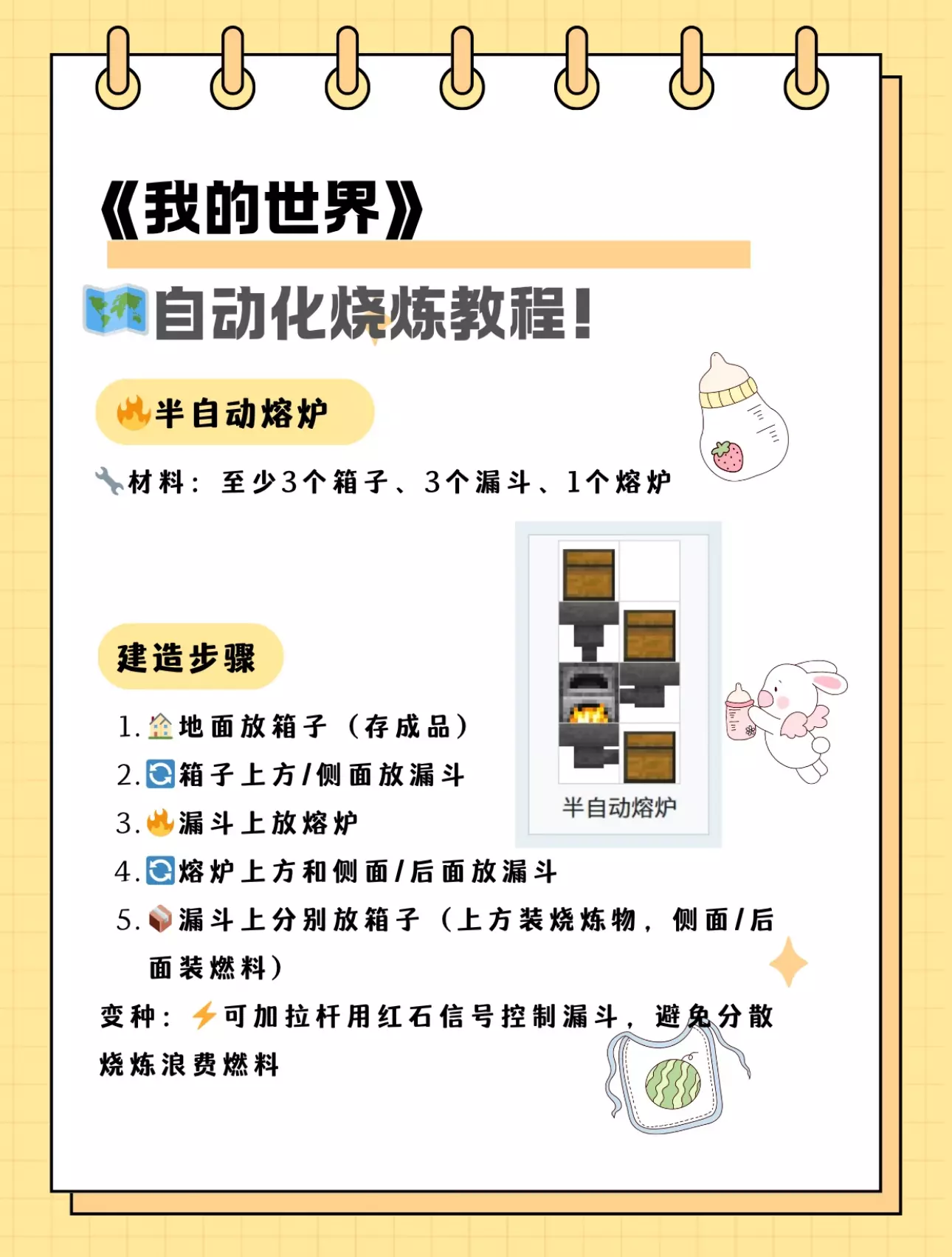 宝子们,🧭超详细的自动化烧炼教程来了! ✨这些技巧让你烧炼速度翻倍! 🌿学会了这些,你就是MC大陆最靓的崽! 📌你还知道哪些小技巧?快来评论区分享吧! #我的世界生存 #我的世界建筑 #我的世界联机 #我的世界服务器 #游戏推荐