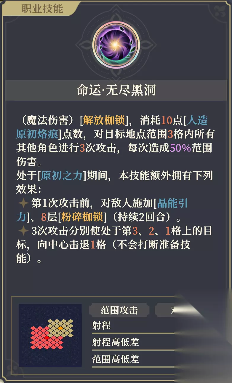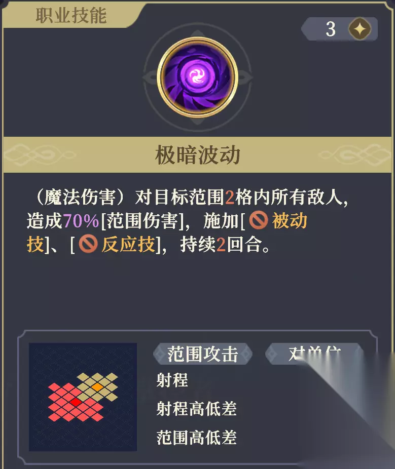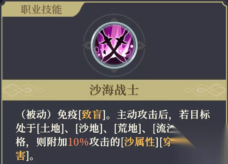 【致盲】减益 减益,所属控制-干扰类,单体攻击有80%概率会被目标闪避。 【沙属性】 会使得[土地]、[沙地]、[荒地]、[流沙]地块产生[沙尘]效果。 【沙尘】 地形效果,角色停留时,禁释放单体伤害技能(使其获得同名减益)。 ✦受到非[沙属性]的范围攻击时,会被驱散。 ✦无法对可以免疫[致盲]的角色起效。 【沙尘】减益 驱散 减益,所属控制-干扰类,禁释放单体伤害技能,不可驱散。无法对可以免疫[致盲]的角 色起效。 “10%攻击”指的是“物攻值加魔攻值之和的10%”。 携带该被动时,需要主动攻击命中特定地形格中的目标才会触发[沙属性]追加伤害。对没有目标的空地释放主动攻击,不触发[沙属性]追加伤害,自然也就无法制造[沙尘]地形。 携带该被动,对指定地形上的敌人释放大招”命运·无尽黑洞“时,会在每次攻击后都追加1次[沙属性]穿透伤害,并在该地形格上生成[沙尘]。 携带该被动,对指定地形上的友军造成伤害时,不会触发附加伤害。 11阶右:极暗波动 攻击+3%