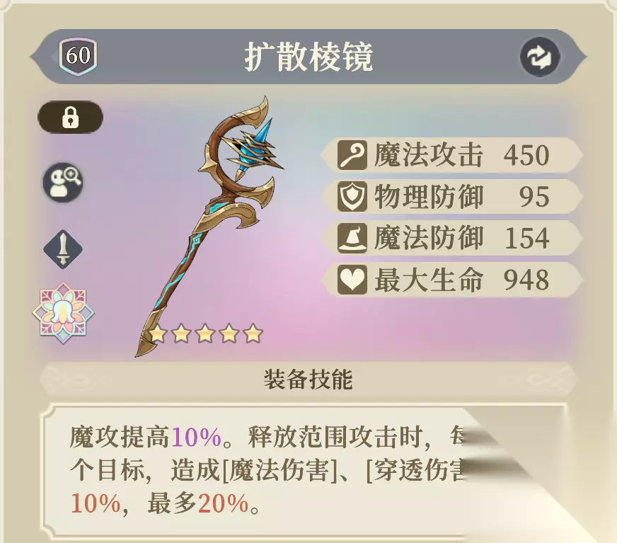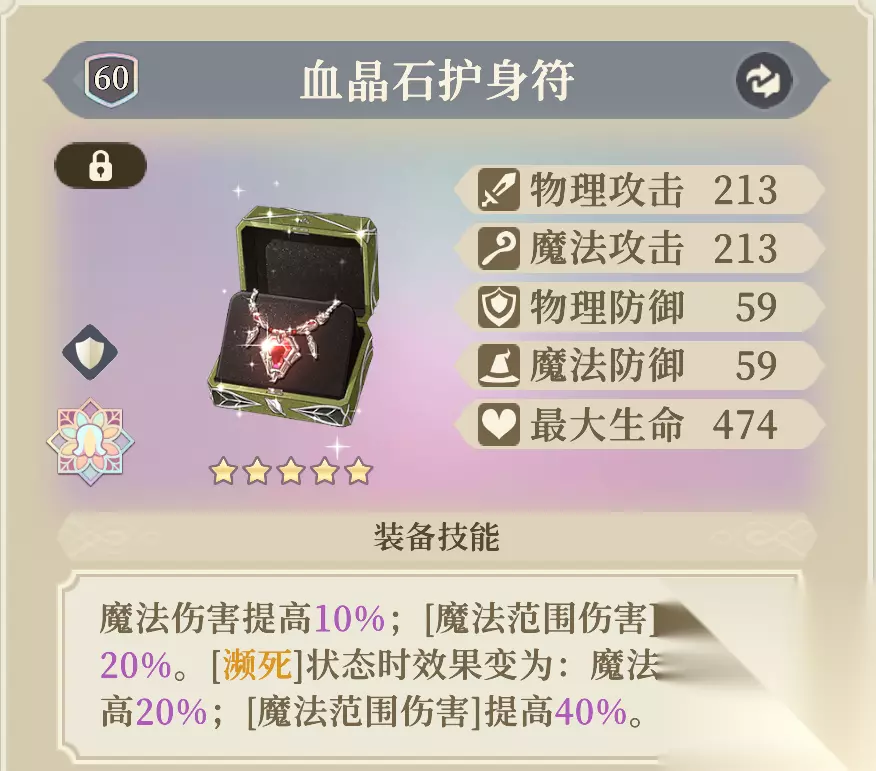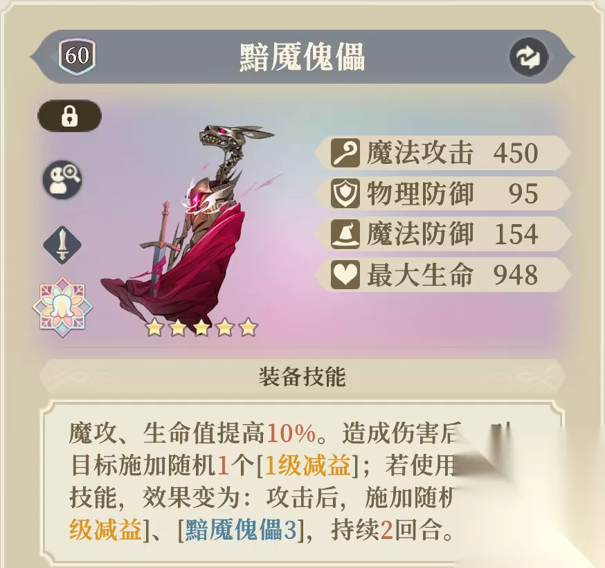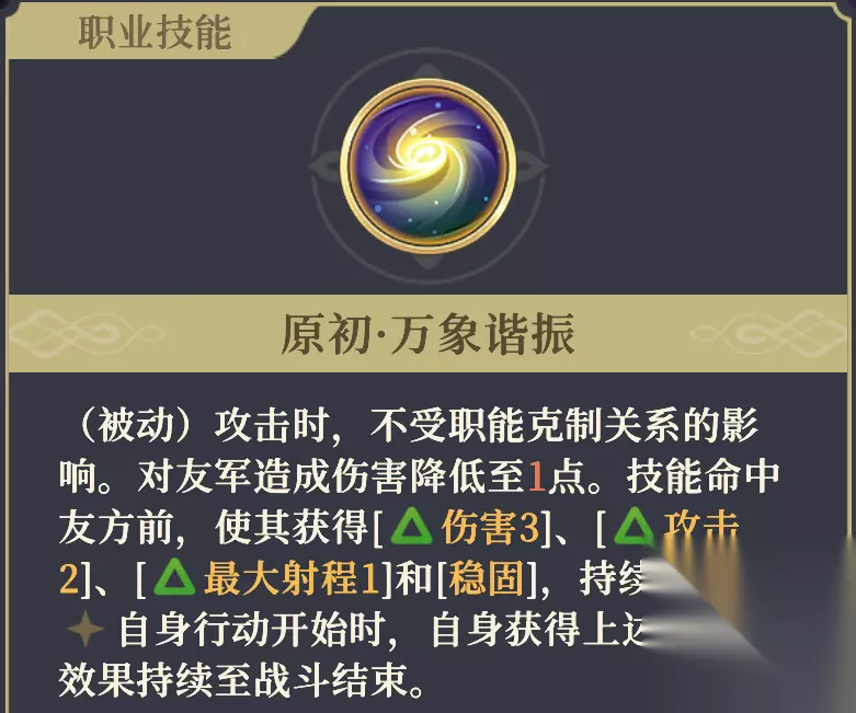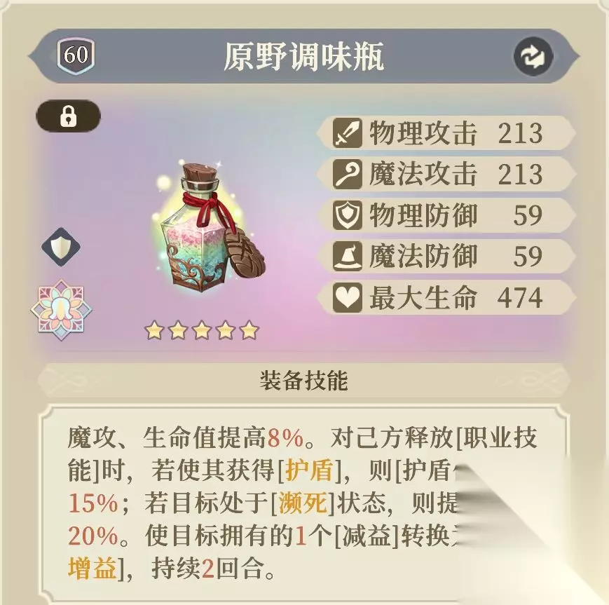 提高魔攻与生命值。 若携带五星的「原野调味瓶」,则每次用[职业技能]攻击己方时,都可以触发将”目标拥有的1个减益转换为2级增益“的效果。大招”命运·无尽黑洞“有3段攻击,可以给波及到的友军驱散3次减益并分别转化为2级增益。