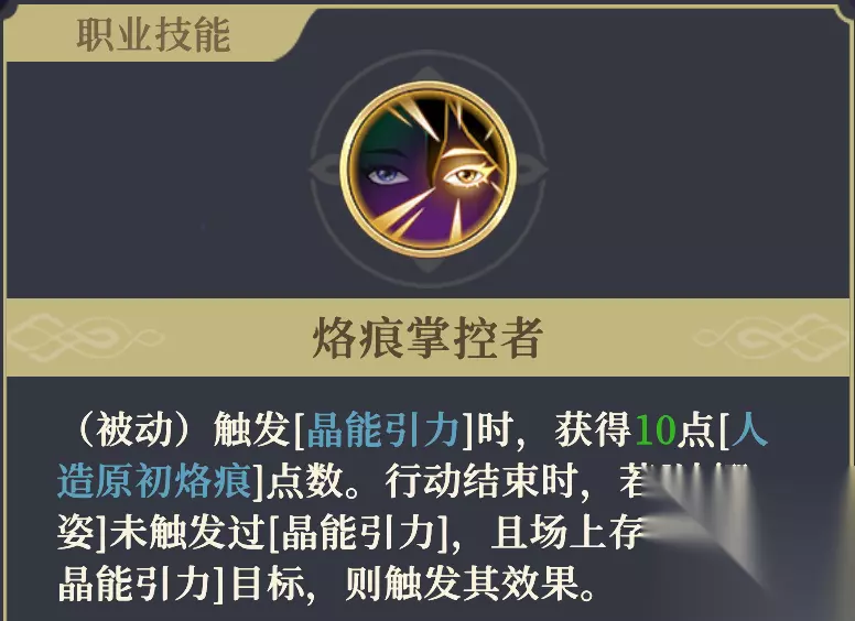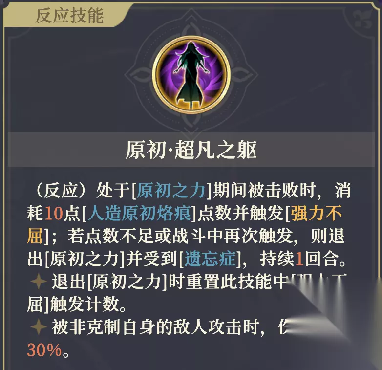 ✦ 拥有[人造原初烙痕]、额外技能[觉醒·原初之力]及其光环效果。 ✦ 所有技能的能量消耗为0。 ✦ 技能释放时,若目标是友军,则对其最终伤害降低98%。且拥有光环,效果:场上所有己方,受到碰撞伤害降低75%。 ✦ 魔攻提高 6% / 6% / 12% / 12% / 18% ;处于[原初之力]期间时,本效果 翻倍 / 翻倍 / 翻倍 / 提高至3倍 / 提高至3倍 。能量上限提高至 5 / 5 / 5 / 7 / 9 点,行动结束时额外回复 0 / 0 / 0 / 2 / 4 点能量。 ✦ 使用[觉醒·原初之力]后,获得“不消耗[人造原初烙痕]点数”的效果,持续至行动结束。(本条2星获取) ✦ 处于[原初之力]期间,行动结束并消耗的[人造原初烙痕]点数后,返还5点。(本条3星获取) ✦ 处于[原初之力]期间,攻击并命中后,若敌人生命值低于10%,则触发[抹煞]。(本条5星获取) 【人造原初烙痕】 计量槽,用于[原初之力]的消耗。 ✦ 战斗开始时,拥有10点,最多50点。 ✦ 行动开始时,会消耗自身所有能量和超过5层的[解放]层数,并转化为等量点数。