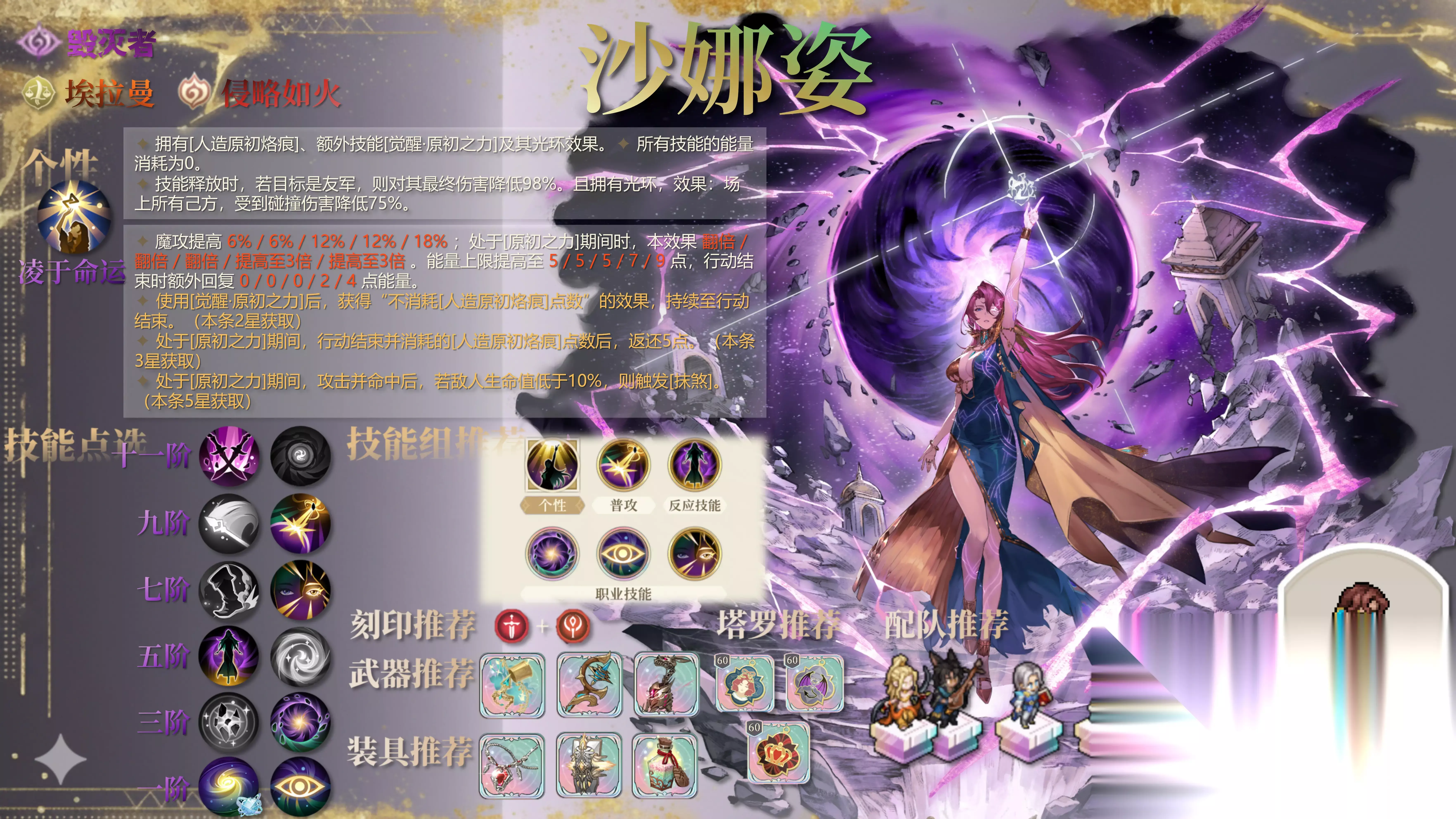 沙娜姿达到3-4星后,【原初之力】的续航压力有所缓解,此时可携带大招“命运·无尽黑洞”。但仍需装备被动“烙痕掌控者”,并依赖队友每回合提供2-4点(能量+解放)的支援,才能满足每回合释放大招的烙痕消耗。剩余一个技能格,依旧在“原初·万象谐振”、“命运·注视”和“晶爆共鸣”中三选一。若有五星露卡玛尔和赫砂同时在场协助补充解放层数,也可不携带“烙痕掌控者”,改为从上述三个技能中选择两个装备。 沙娜姿达到5星后,只要携带“烙痕掌控者”,即可完全依靠自身实现每回合开启大招并维持【原初之力】。剩余一个技能格,同样在“原初·万象谐振”、“命运·注视”和“晶爆共鸣”中三选一。若有五星露卡玛尔在场协助补充解放层数,也可放弃“烙痕掌控者”,改为从这三个技能中选择两个装备。 四、装备塔罗推荐 刻印推荐:宝剑+权杖 1. 武器推荐 注意:虽然携带SP萨曼莎专武「破净万恶之光」的极限输出与专武「宿命独扼」差不太多,但是沙娜姿并非可以频繁打出回合外伤害的角色,无法保证每回合都能获得「破净万恶之光」给的增益,因此不推荐携带「破净万恶之光」。