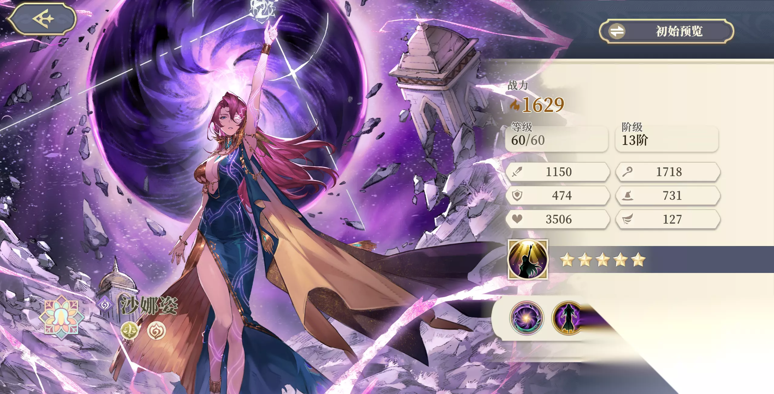 阵营:埃拉曼、侵略如火 基础魔攻值:1718,全角色排名第1 基础物防值:474,全角色排名第65,毁灭者中排名第14 基础魔防值:731,全角色排名第5,毁灭者中排名第5 基础生命值:3506,全角色排名第59,毁灭者中排名13 基础速度值:127,全角色排名第92,毁灭者中排名14 基础移动力:3。 二、个性解析