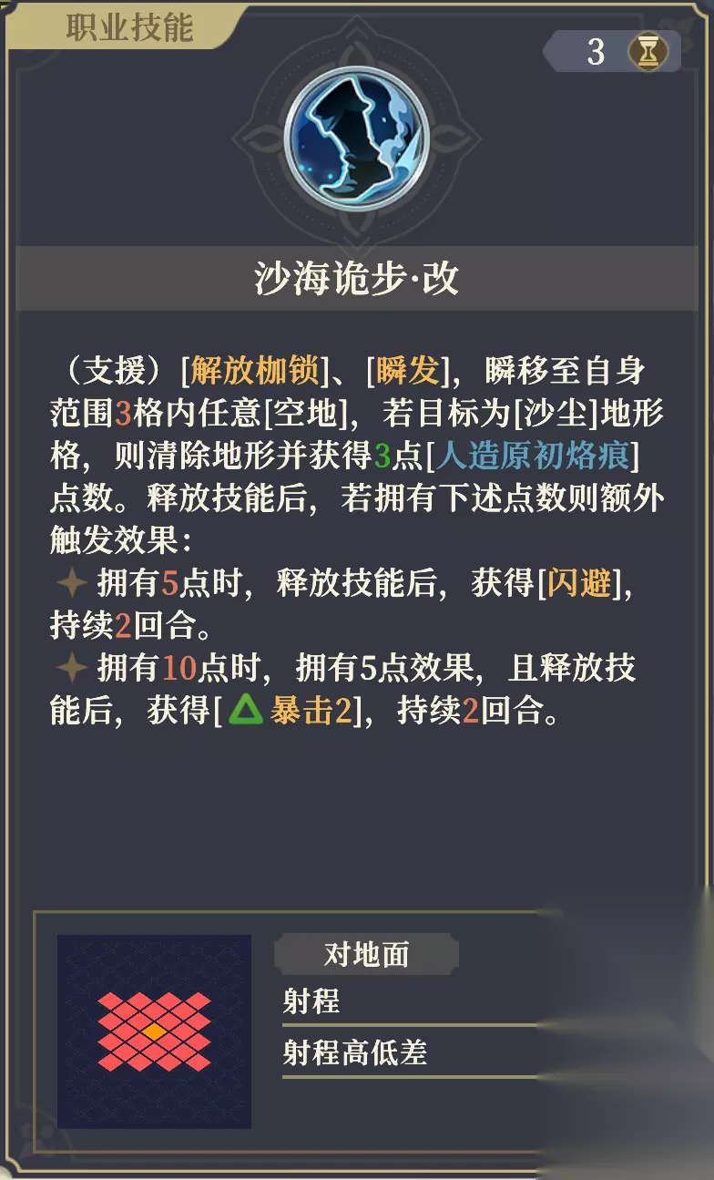 平平无奇的通用反应技。 受到来自友军的主动攻击后,也能触发回能效果。 7阶左:沙海诡步·改 生命+3%