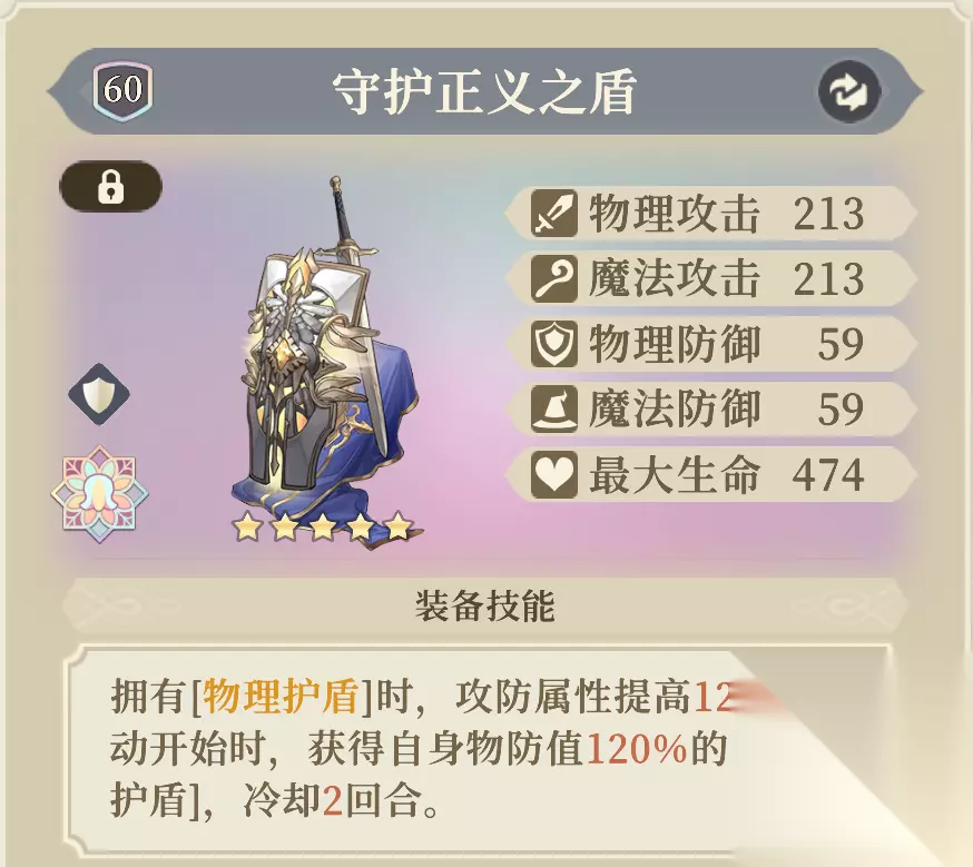 泛用度最高的装具之一,可大幅提高攻防属性,并提供物理护盾。 如果没有「守护正义之盾」,也可以用「诡诈之影」、「原时沙漏」等通用加攻装具。