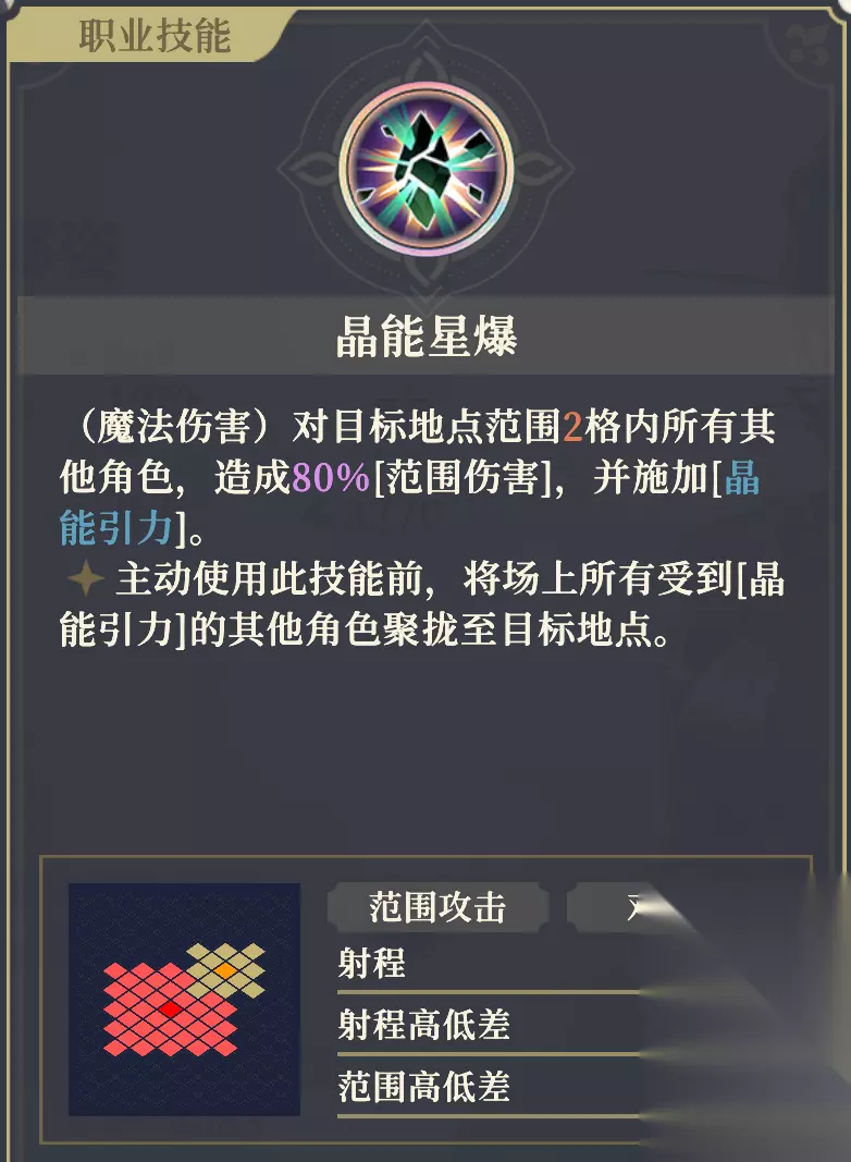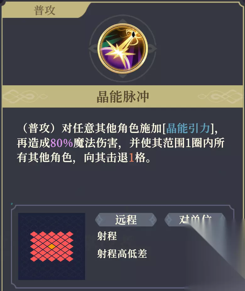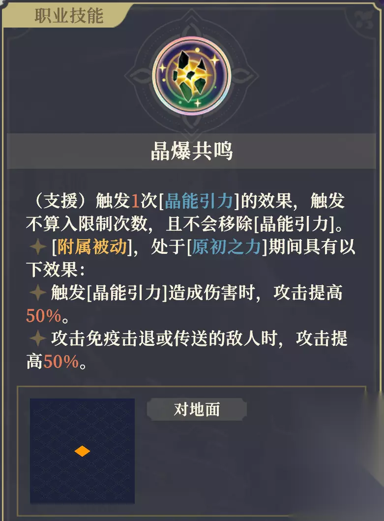 该技能可造成斜向击退。 由于是先施加[晶能引力],再造成击退,所以只要范围1圈内的角色不免疫击退,就必定会发生碰撞并触发[晶能引力]的效果,使沙娜姿对持有者及场上所有受到[晶能引力]目标范围3格内的所有其他角色造成50%魔法伤害。 11阶左:沙海战士 攻击+3%