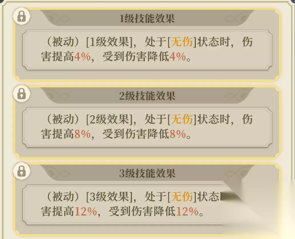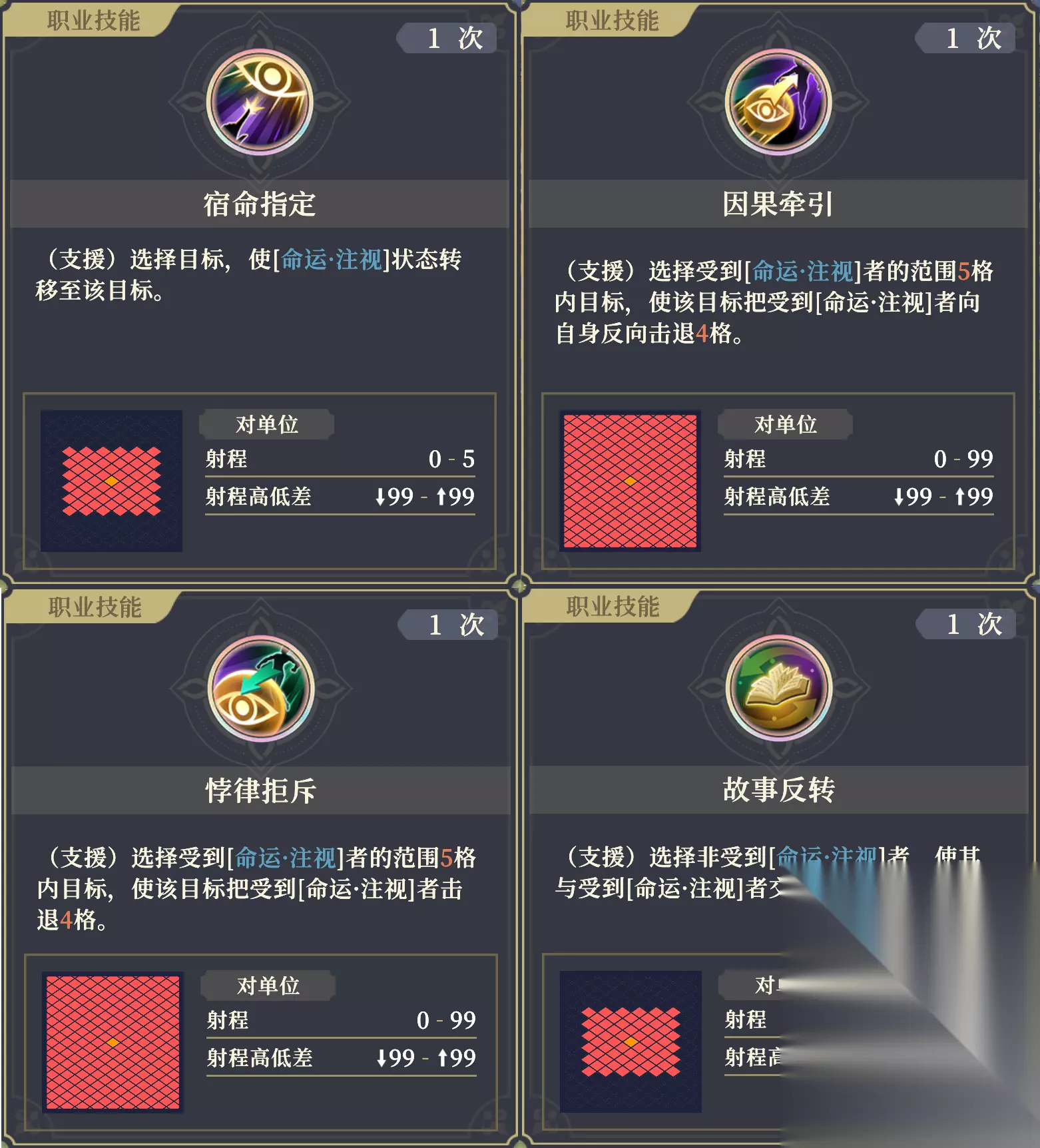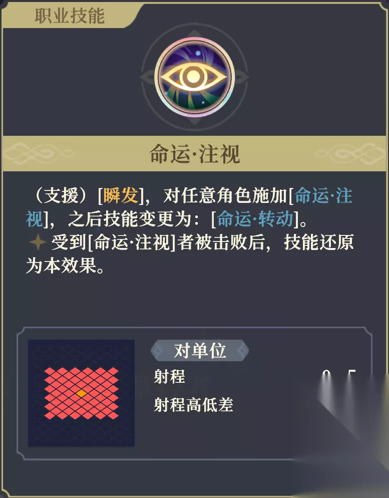 【▲伤害3】增益 增益,造成伤害提高30%。 【▲攻击2】增益 增益,物攻、魔攻提高20%。 【▲最大射程1】增益 非近战技能最大射程增加1格。 【稳固】增益 免疫来自敌方的击退。 非常强力的被动,携带后能大幅提高沙娜姿的输出。 携带该被动时,对友军造成的伤害降低至1点,包括但不限于魔法伤害、穿透伤害、 碰撞伤害 。 【▲最大射程1】的效果仅对主动技能生效。另外,诸如卡丽丝的“诸罪并罚”、SP萨曼莎的“审判诸罪之光”等不涉及自身位移的 指向性技能 ,都不受到射程影响;法卡尔的“守护铃兰之剑”等一部分 警戒技能 ,会受到射程影响。 1阶右:命运注视 防御+3%