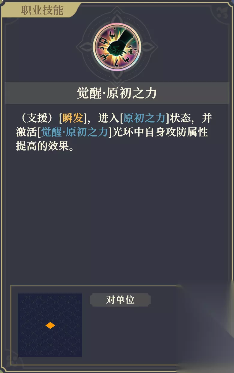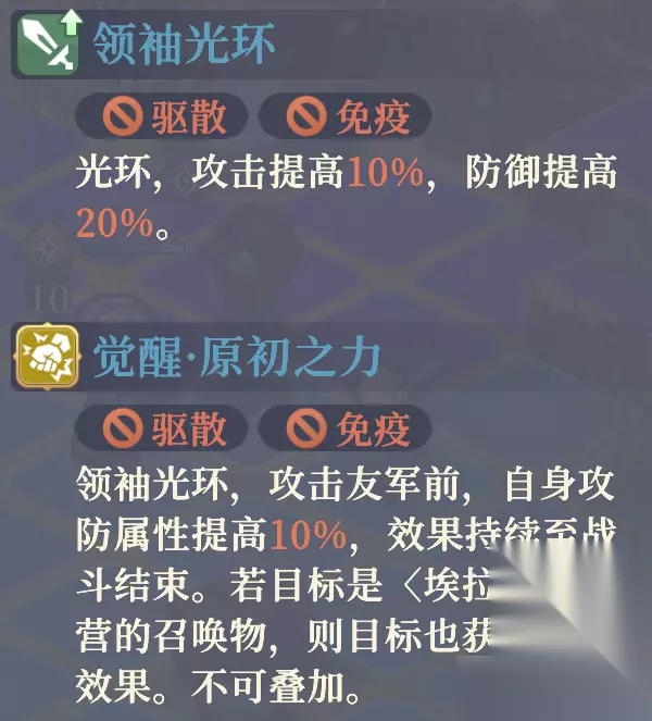 【觉醒·原初之力】 技能:(支援)[瞬发],进入[原初之力]状态。 ✦ 再激活同名光环中自身攻防属性提高的效果。(意思是不需要去攻击友军,直接获得“自身攻防属性提高10%,效果持续至战斗结束”的效果) 领袖光环:场上所有阵营为〈埃拉曼〉的己方,攻击提高10%,防御提高20%。 ✦ 攻击友军前,自身攻防属性提高10%,效果持续至战斗结束。 ✦ 若目标是〈埃拉曼〉阵营的己方召唤物,则目标也获得相同效果。