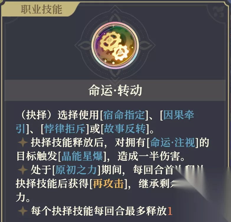 只能在不处于[原初之力]状态时使用。无任何消耗,也没有使用次数的限制。 在[原初之力]状态下,沙娜姿攻击力提高20%,且技能“命运·转动”、“晶爆共鸣”和“命运·无尽黑洞” 均会获得额外效果。同时,每回合行动结束时自动消耗10点[人造原初烙痕],若点数不足则会退出[原初之力]并陷入持续1回合的[遗忘症]。 初始技能:晶能星爆