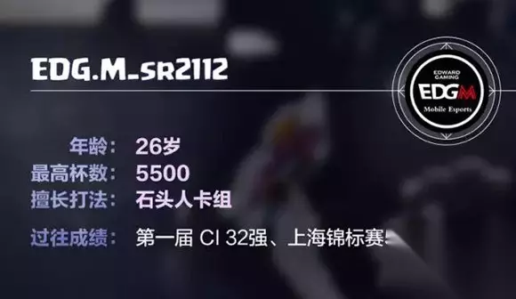 有一种缘分,叫陪朋友去相亲,结果对方看上了自己,这样阴差阳错的故事就发生在sr2112的身上。“朋友打进《我是选手》线下赛,我来加油,结果就被战队看上了……”而事实证明,EDG.M星探毒辣的眼光并没有看错,这个看似普通的观众绝非等闲之辈。 作为一名元老级玩家,sr2112的参赛史可以追溯到2016年,曾杀入ci第一周线下周赛,随后又在上海锦标赛杀入前50。“16年参加了不少比赛,起起伏伏,也算是见证了CR电竞的发展吧!”虽曾短暂退隐,但职业联赛的号角还是让sr2112热血重燃,于是一个美丽的巧合后,他宣告了自己的回归。 容错率极高的小费矿工套,是sr2112的绝活,而作为一名26岁的“老将”,他的打法却偏激进,有了优势就喜欢浪。“成为职业选手,不但技术要精益求精,心态上更要稳一点。”作为队内中流砥柱,经验丰富的sr2112除了取胜拿分,还肩负着培养新人的重任,成为真正的更衣室领袖。