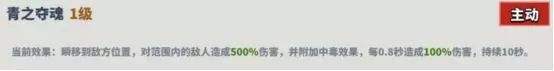 👉描述:瞬移到敌方位置,对范围内的敌人造成500%伤害,并附加中毒效果,每0.8秒造成100%伤害,持续10秒。