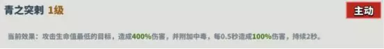 👉描述:攻击生命值最低的目标,造成400%伤害,并附加中毒,每0.5秒造成100%伤害,持续2秒。